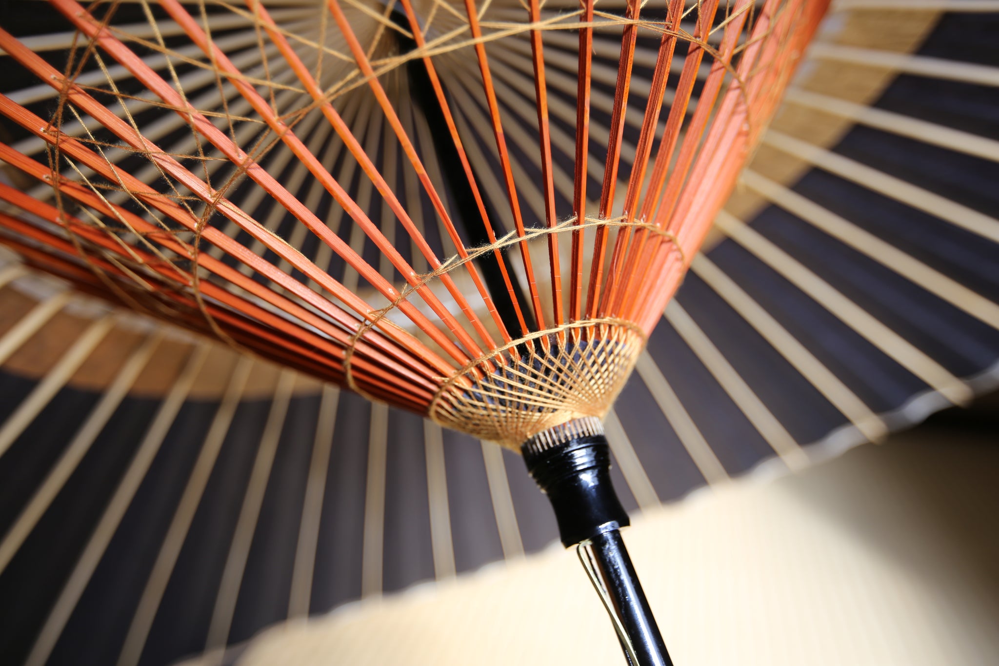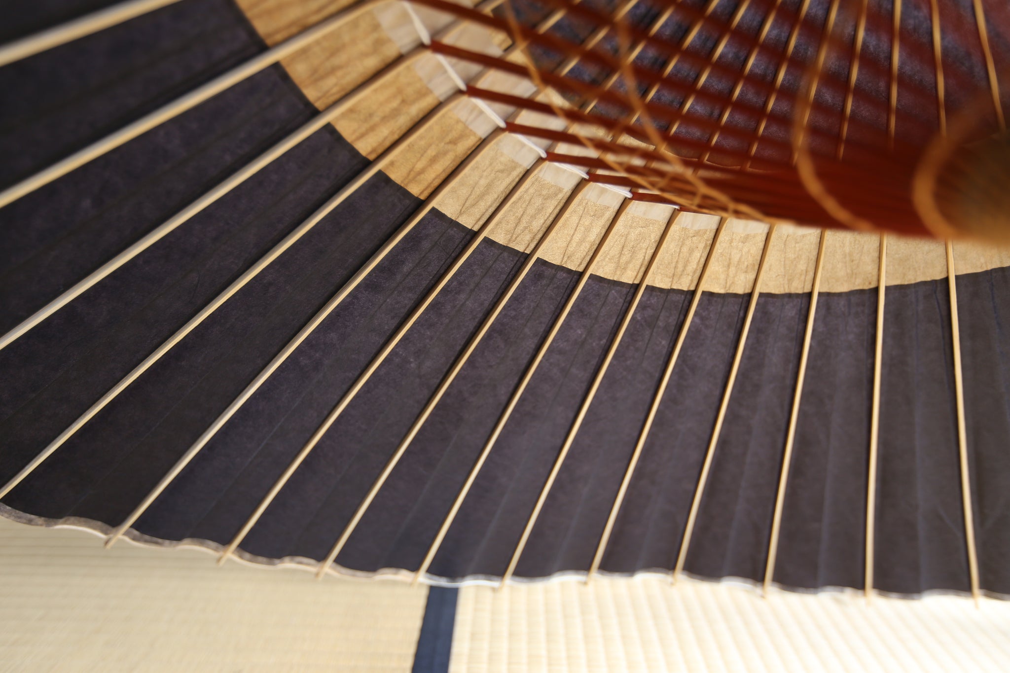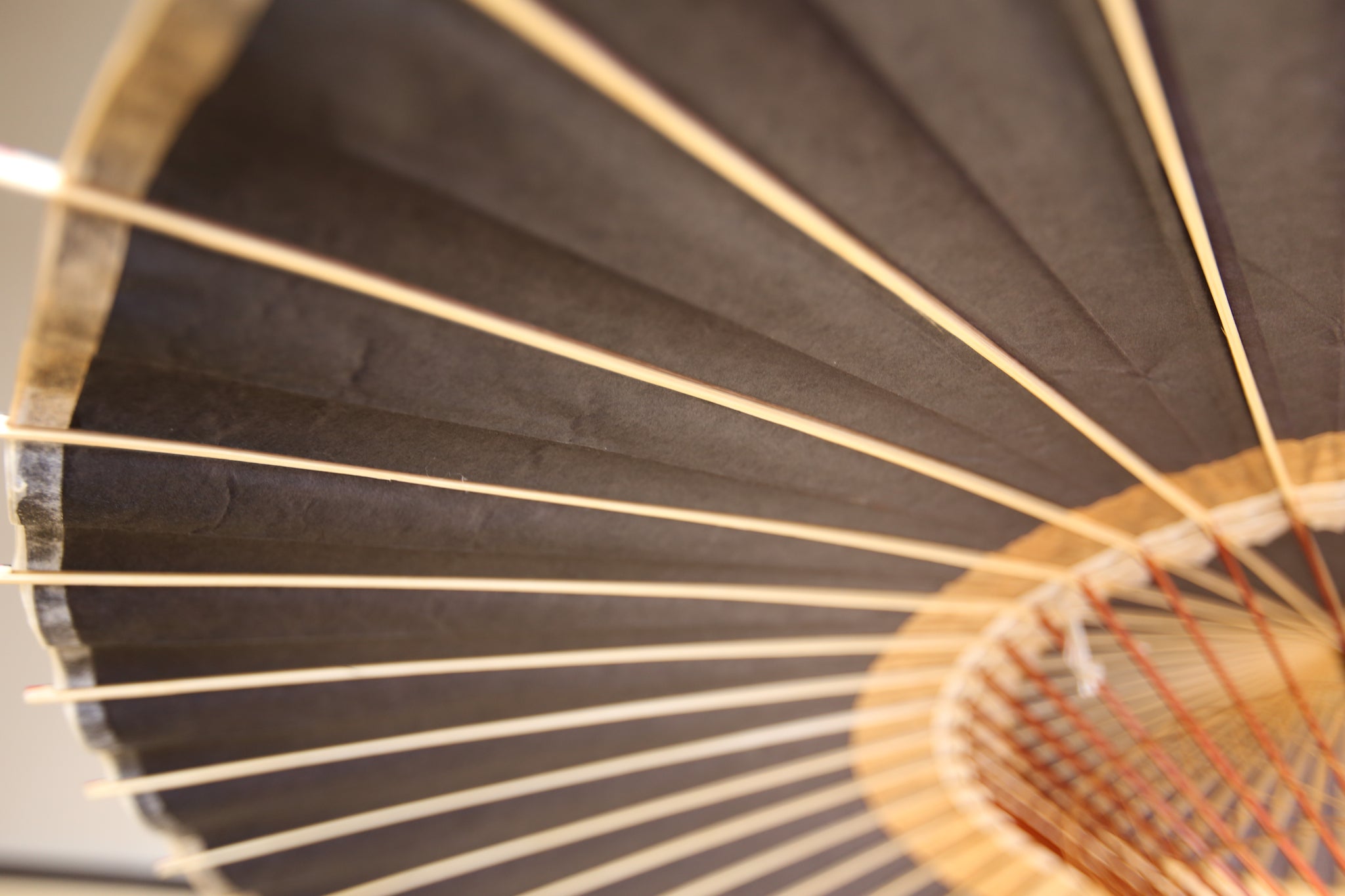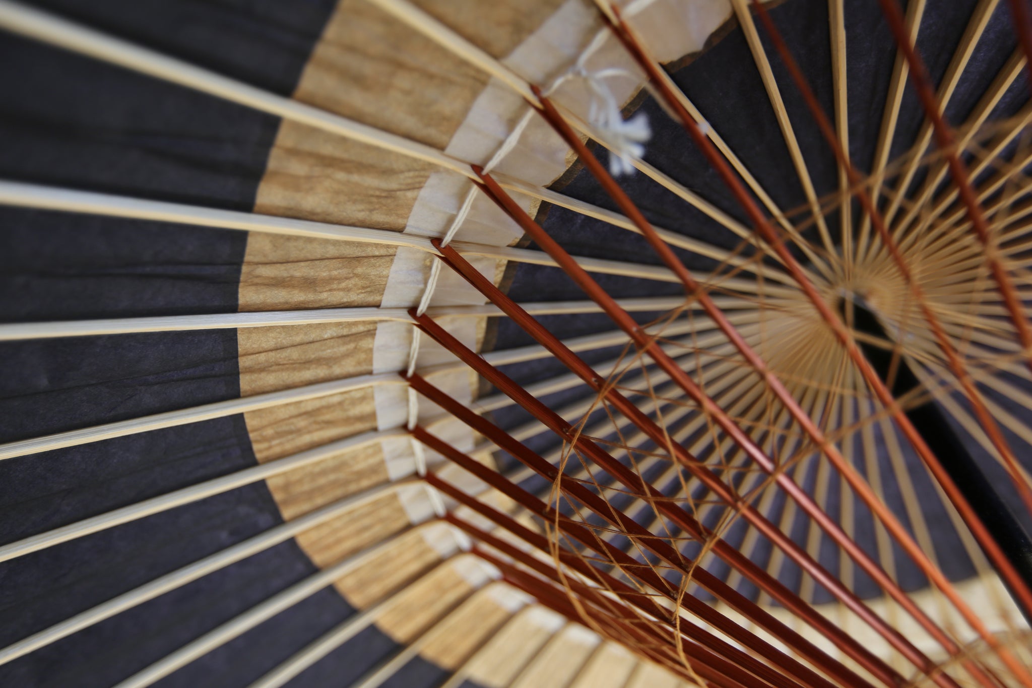 The framework of a Japanese umbrella is made from a piece of bamboo that is split evenly and assembled so that when the umbrella is folded, it returns to its original shape.
