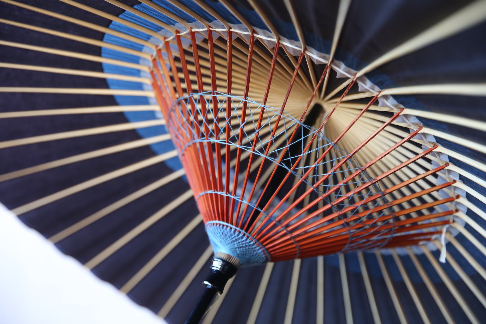 The framework of a Japanese umbrella is made from a piece of bamboo that is split evenly and assembled so that when the umbrella is folded, it returns to its original shape.