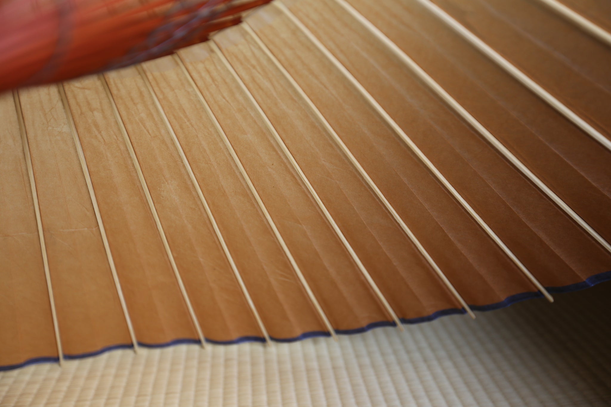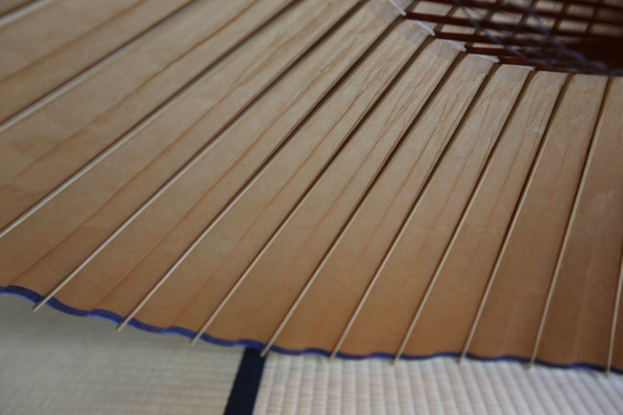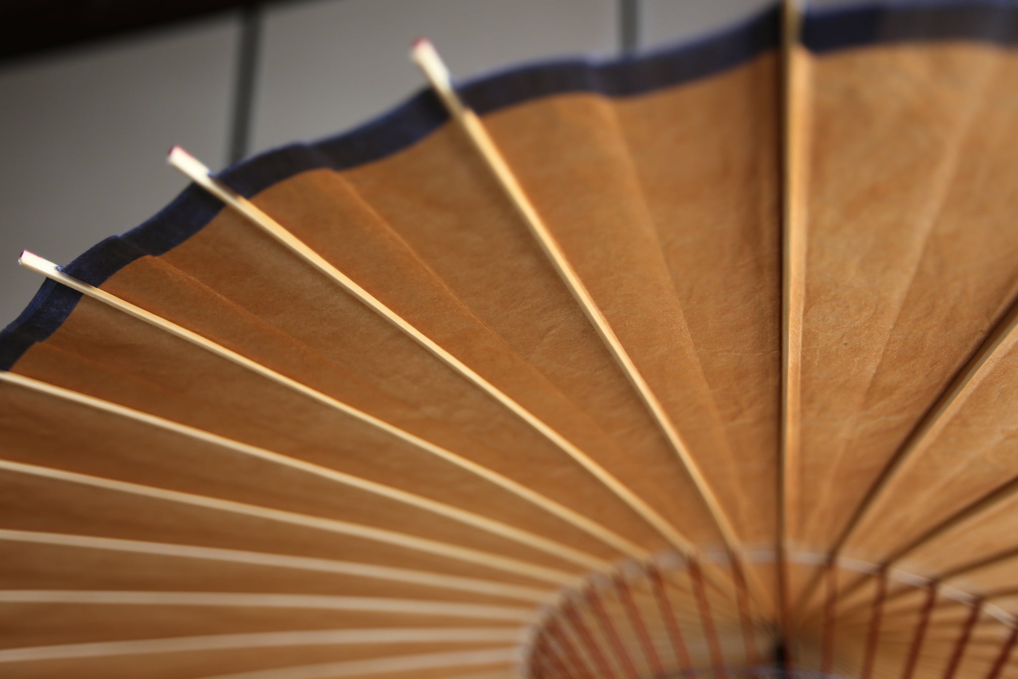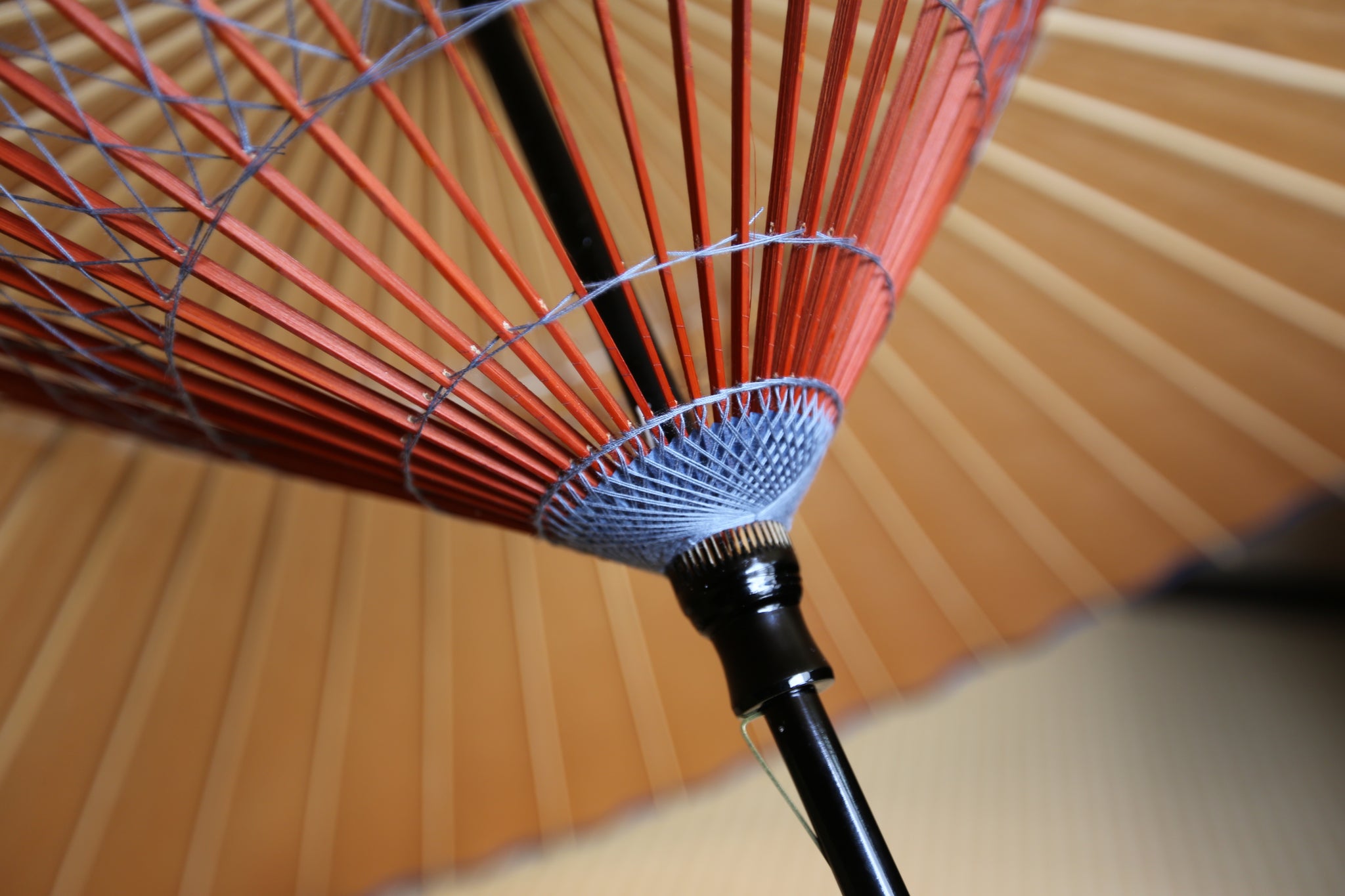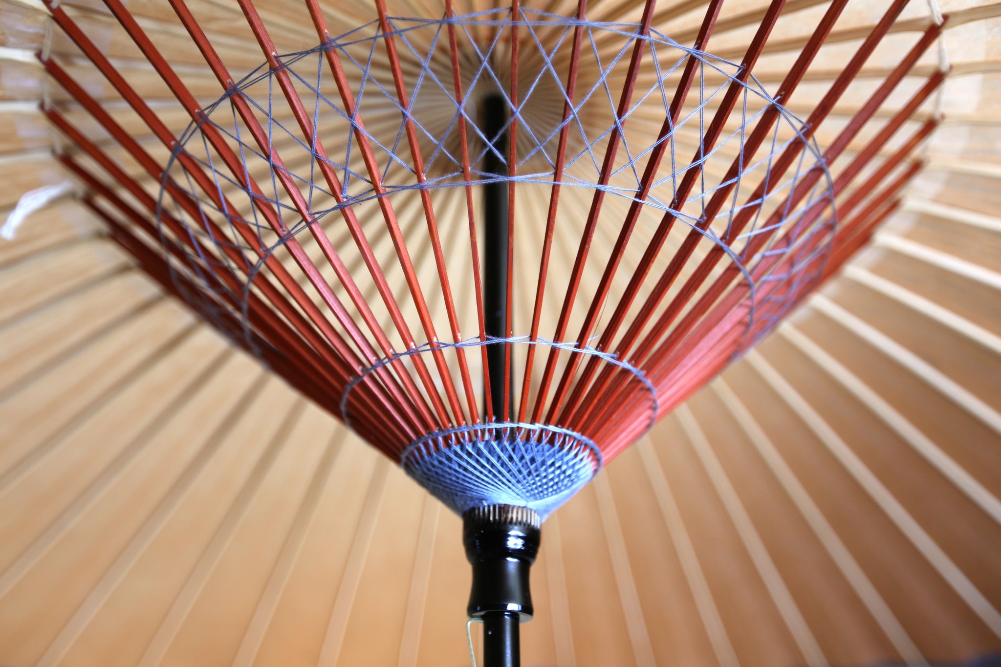The framework of a Japanese umbrella is made from a piece of bamboo that is split evenly and assembled so that when the umbrella is folded, it returns to its original shape.