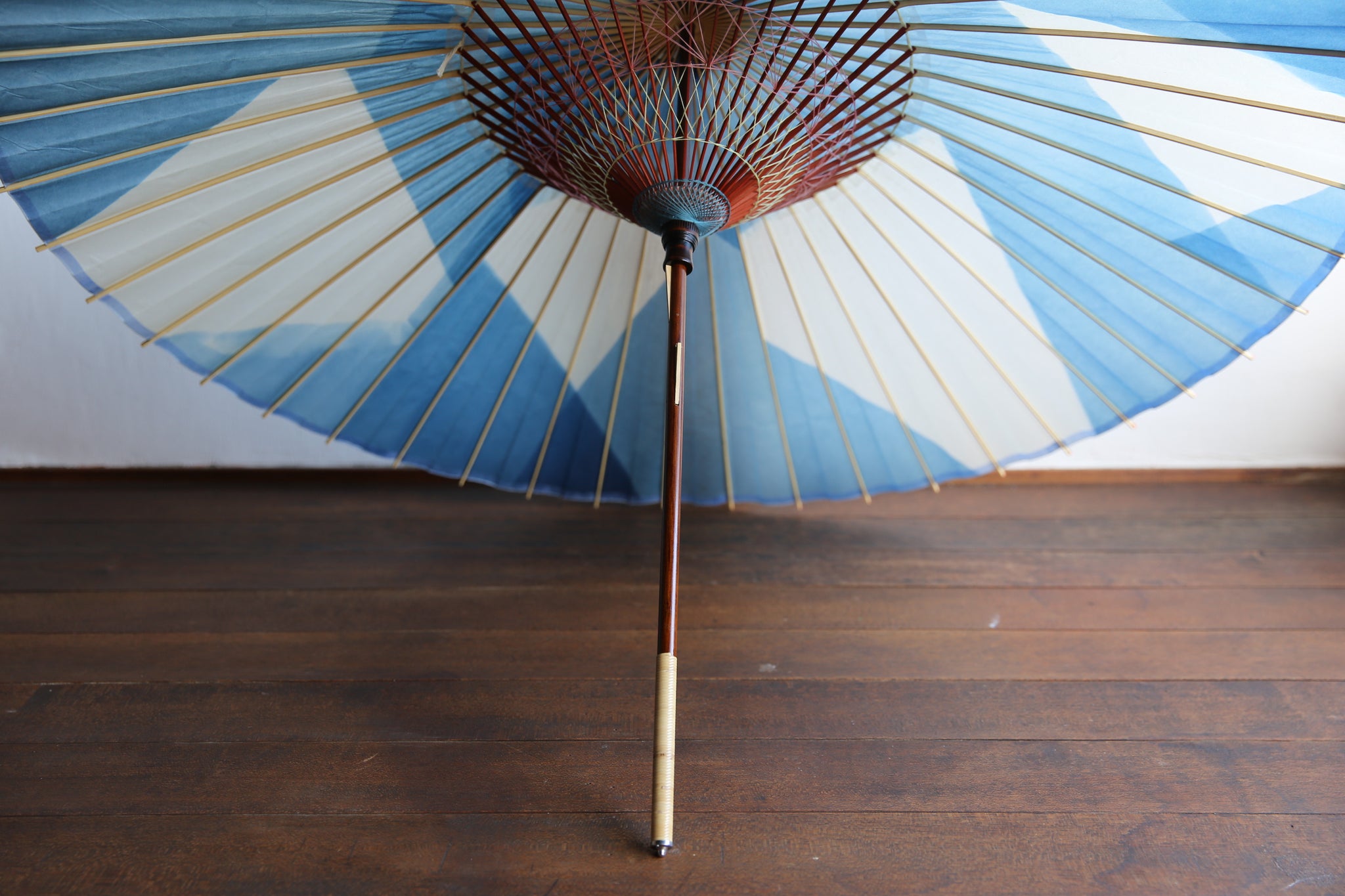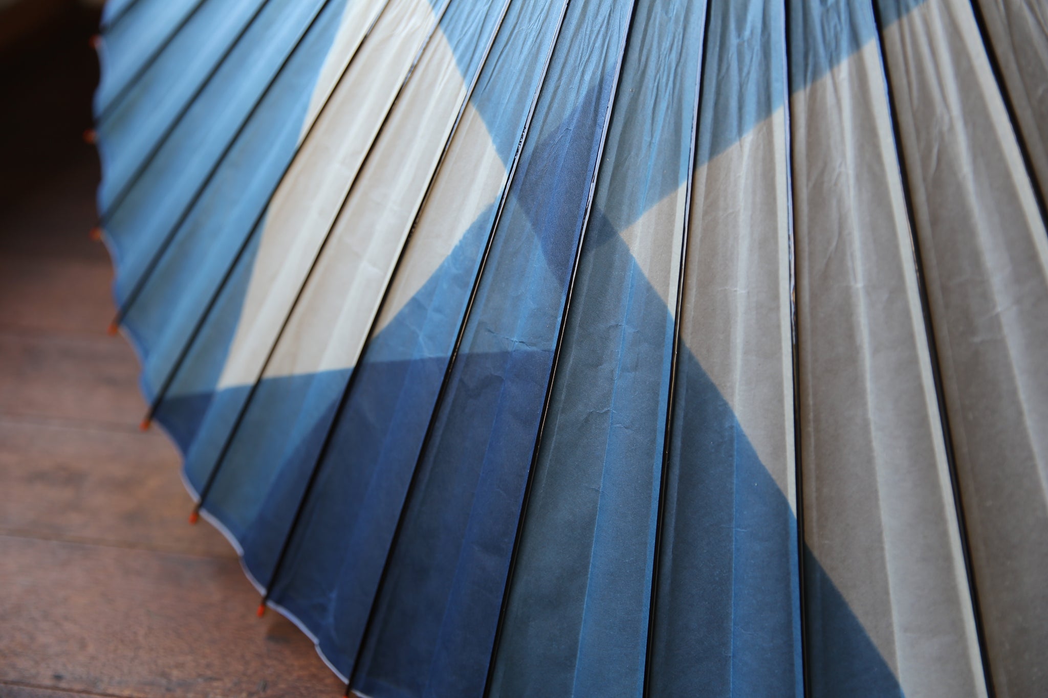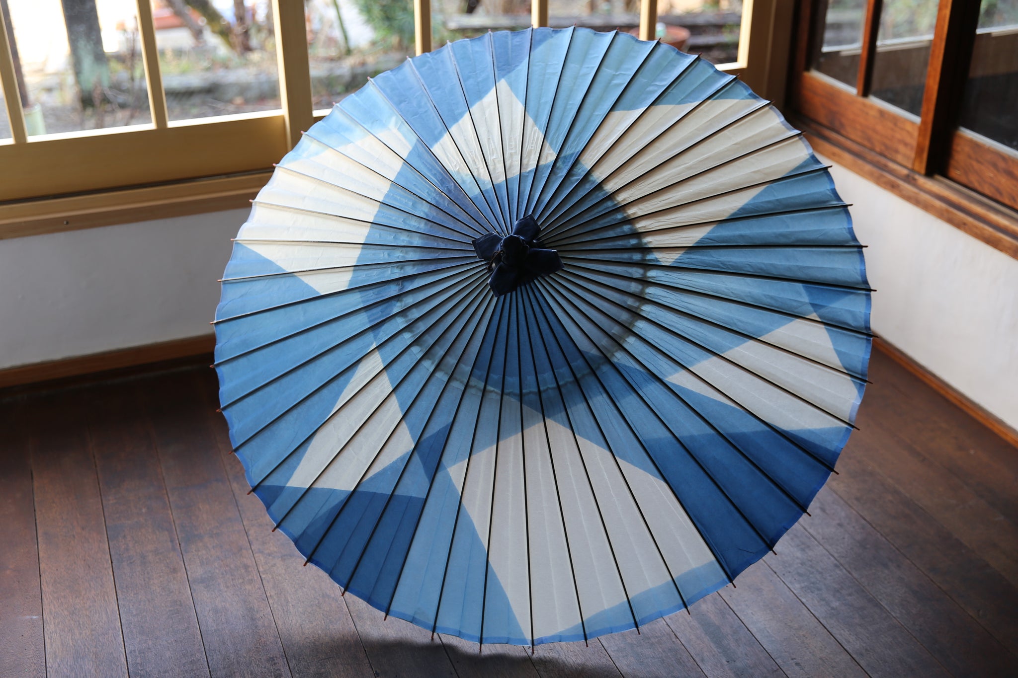 An unmistakable special collaboration Japanese umbrella made from Mino handmade Japanese paper dyed with indigo grown in Gifu's Ishitoru Shiro.