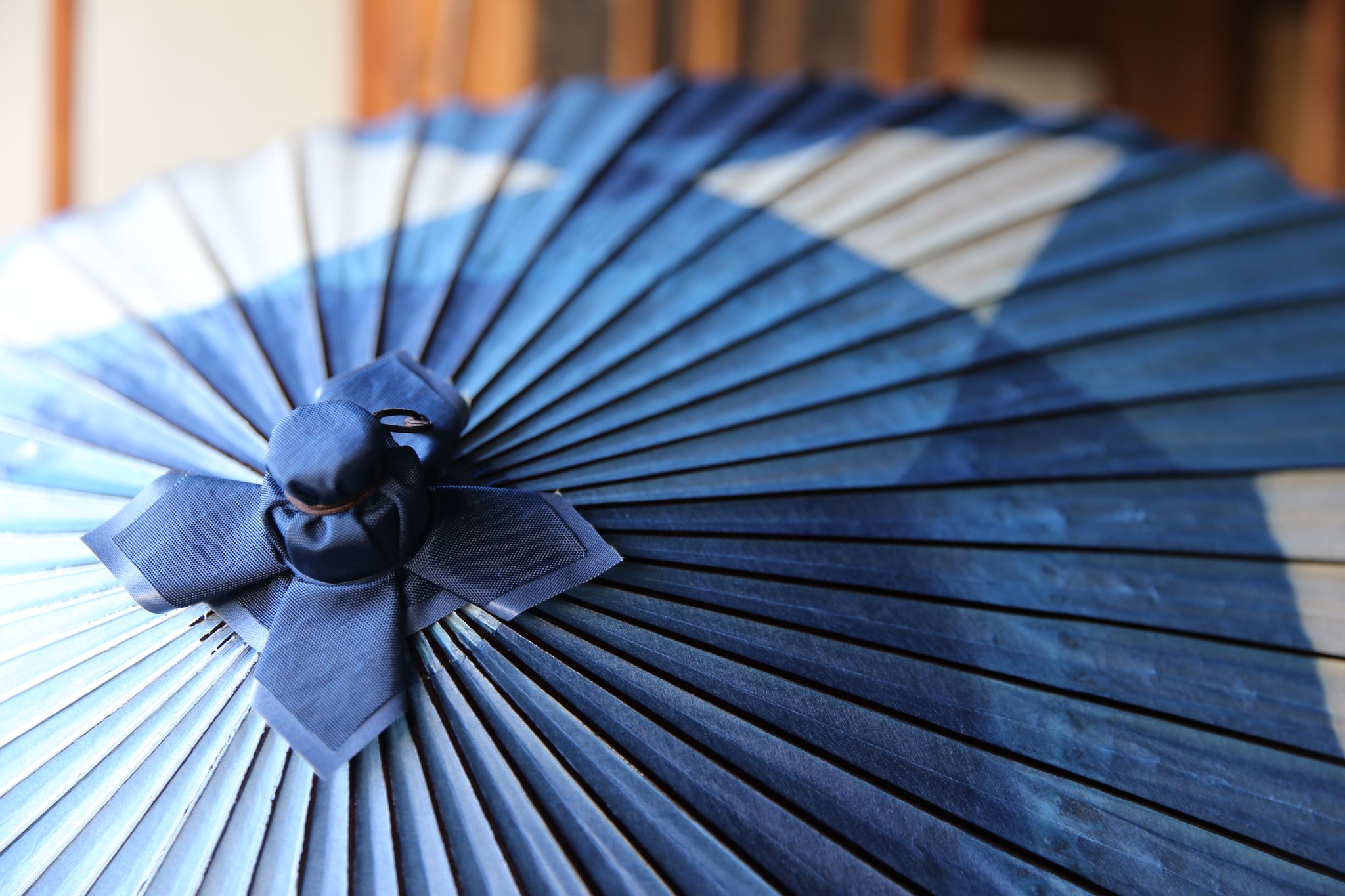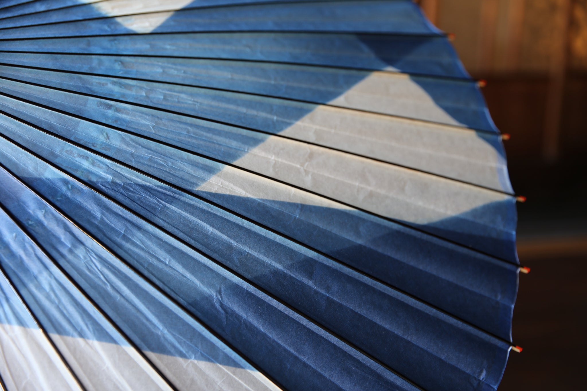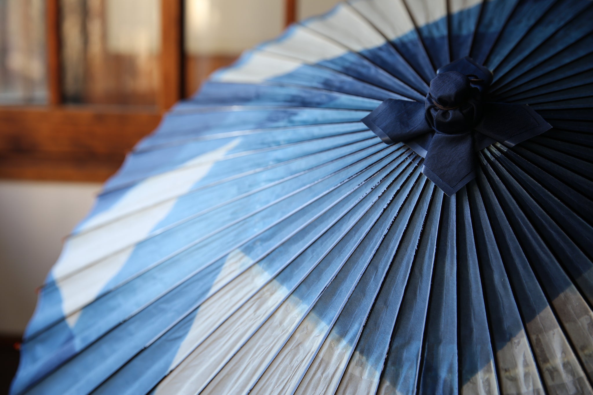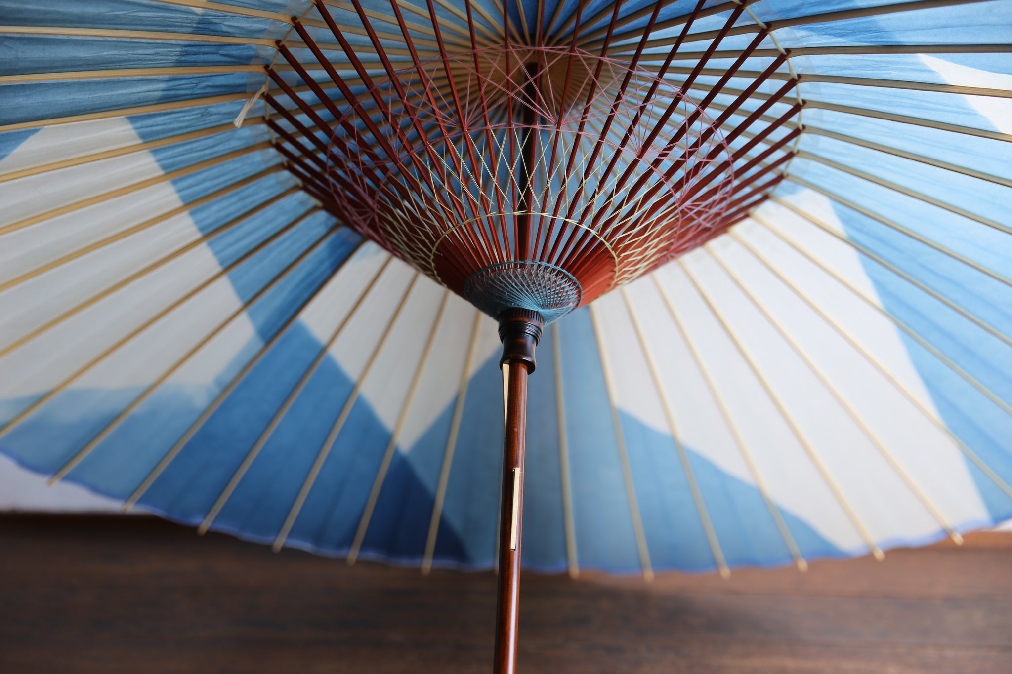 An unmistakable special collaboration Japanese umbrella made from Mino handmade Japanese paper dyed with indigo grown in Gifu's Ishitoru Shiro.