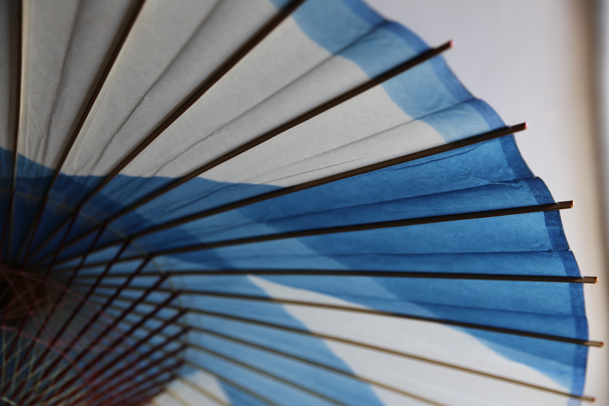 The framework of a Japanese umbrella is made from a piece of bamboo that is split evenly and assembled so that when the umbrella is folded, it returns to its original shape.