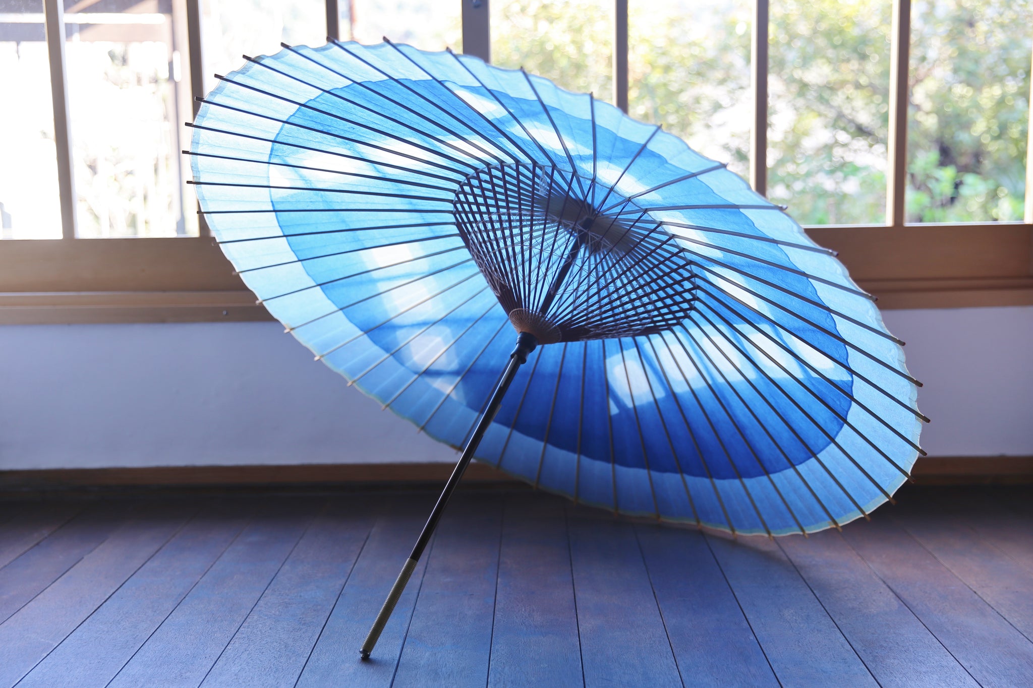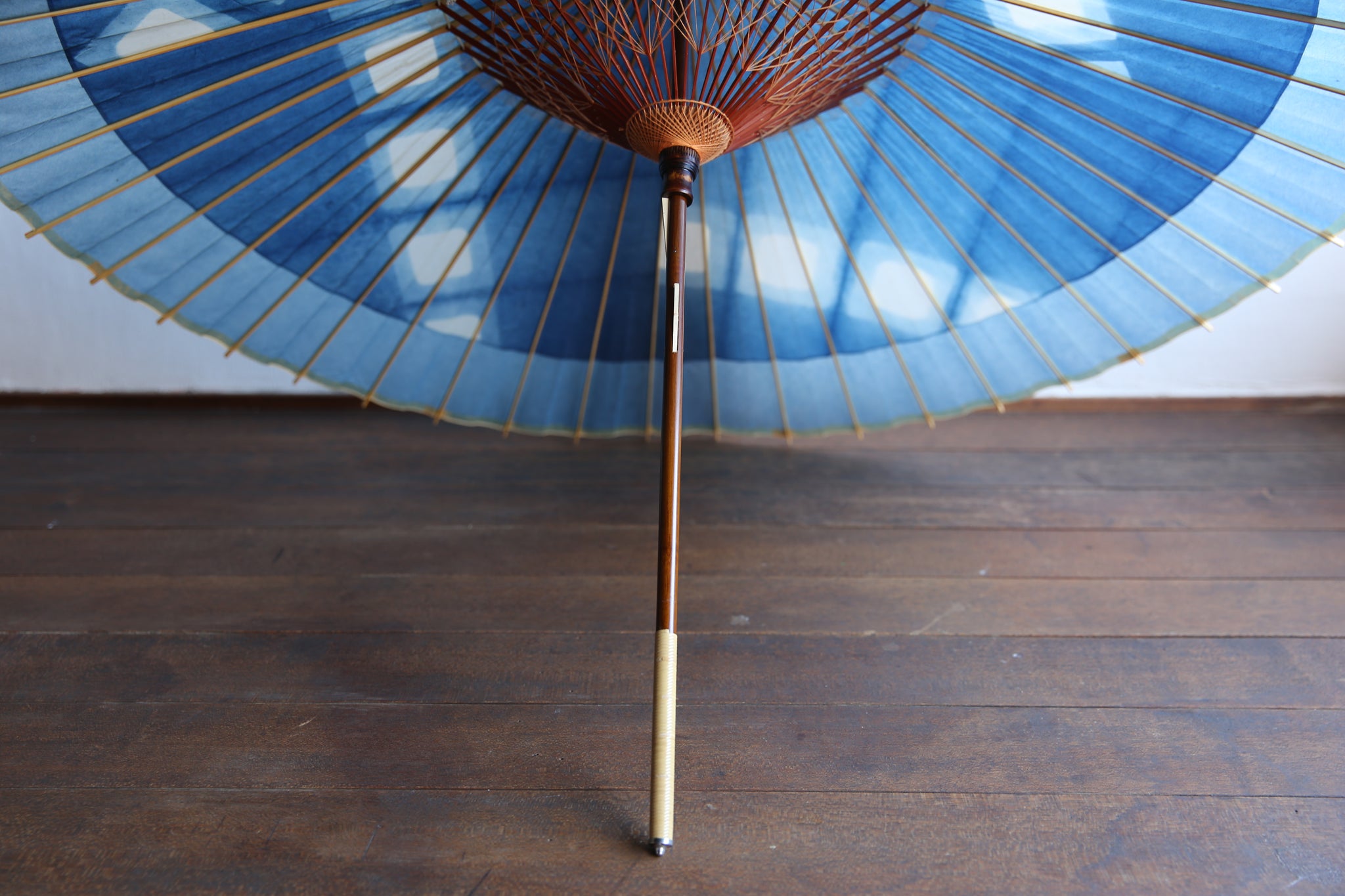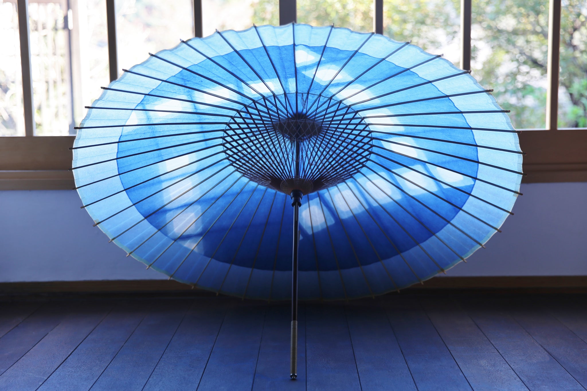 An unmistakable special collaboration Japanese umbrella made from Mino handmade Japanese paper dyed with indigo grown in Gifu's Ishitoru Shiro.