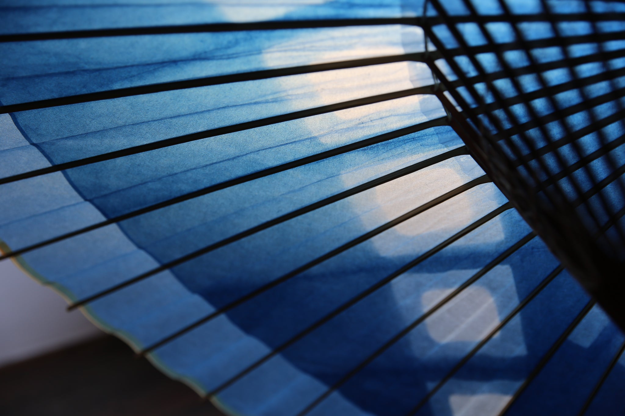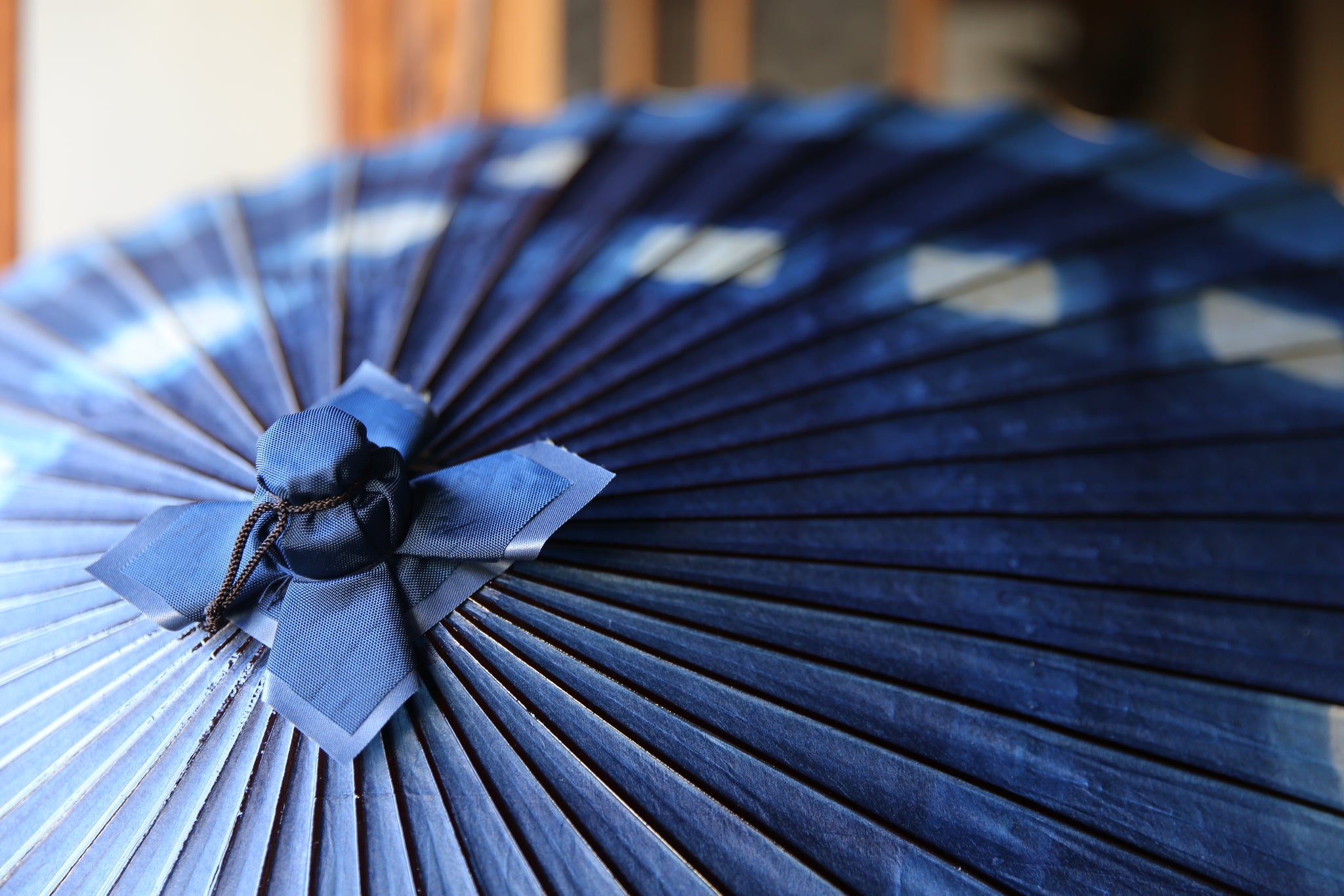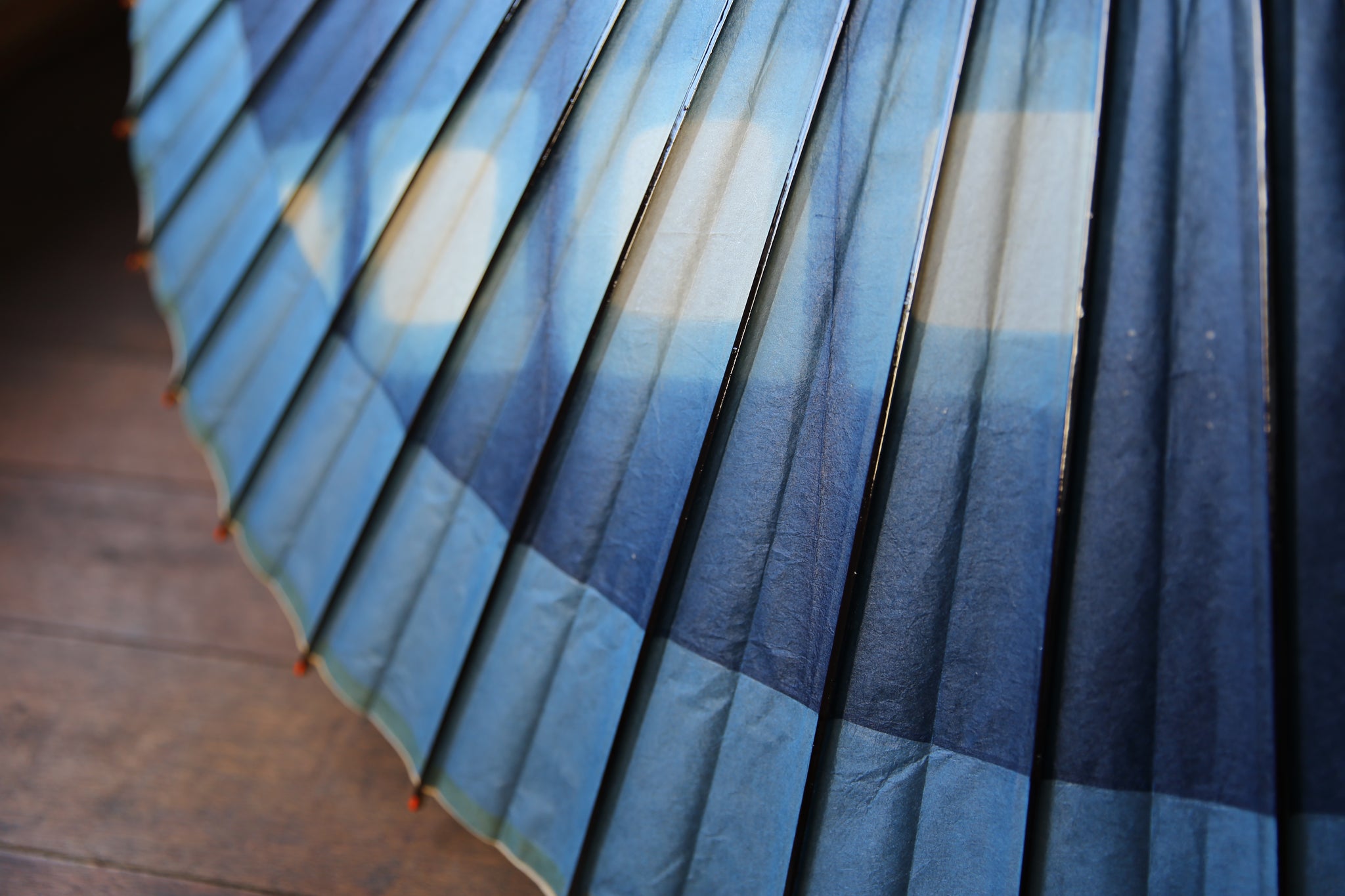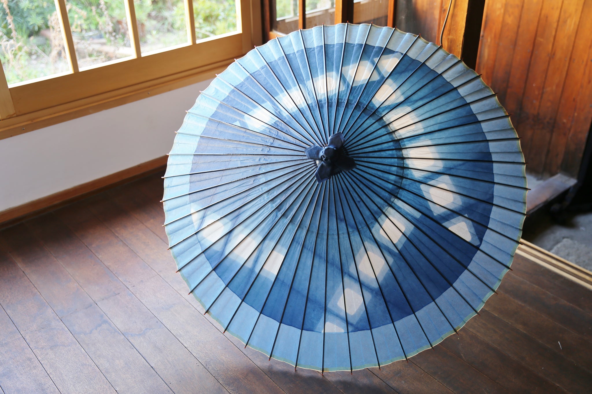 An unmistakable special collaboration Japanese umbrella made from Mino handmade Japanese paper dyed with indigo grown in Gifu's Ishitoru Shiro.