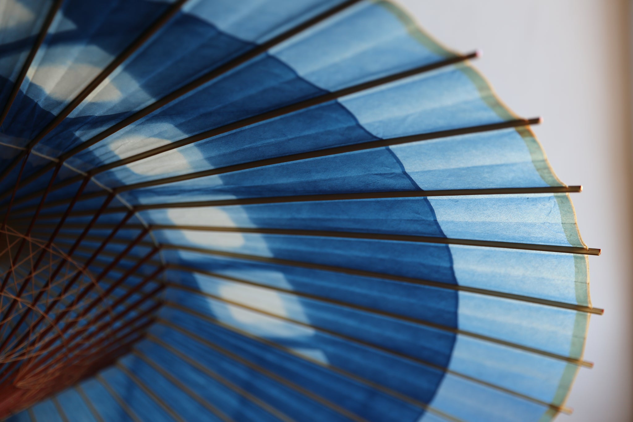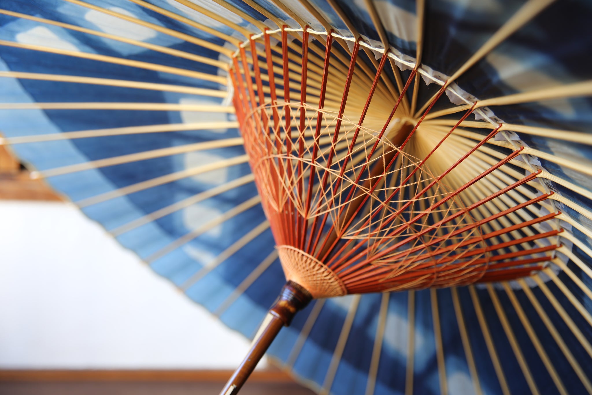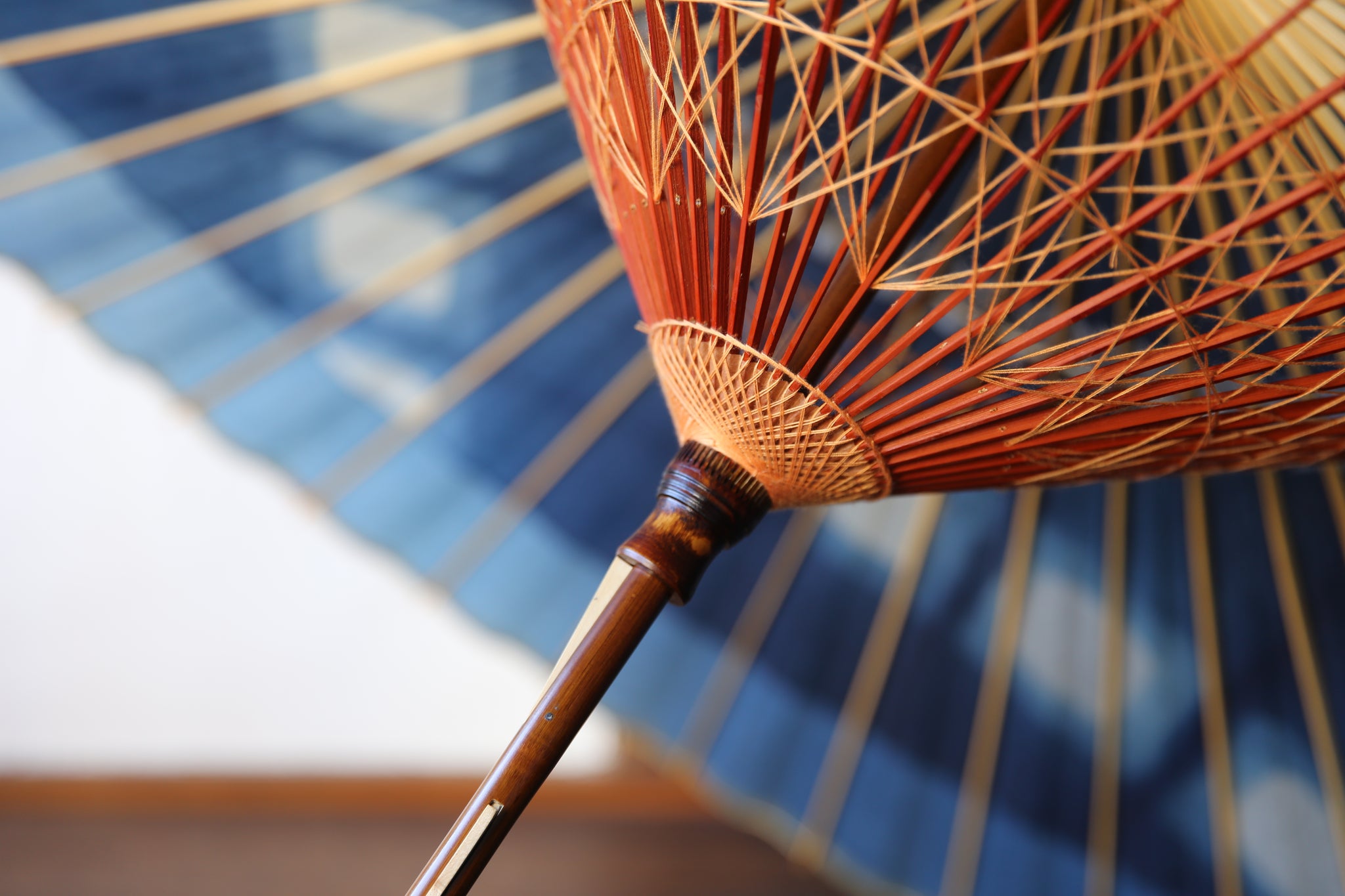 The framework of a Japanese umbrella is made from a piece of bamboo that is split evenly and assembled so that when the umbrella is folded, it returns to its original shape.