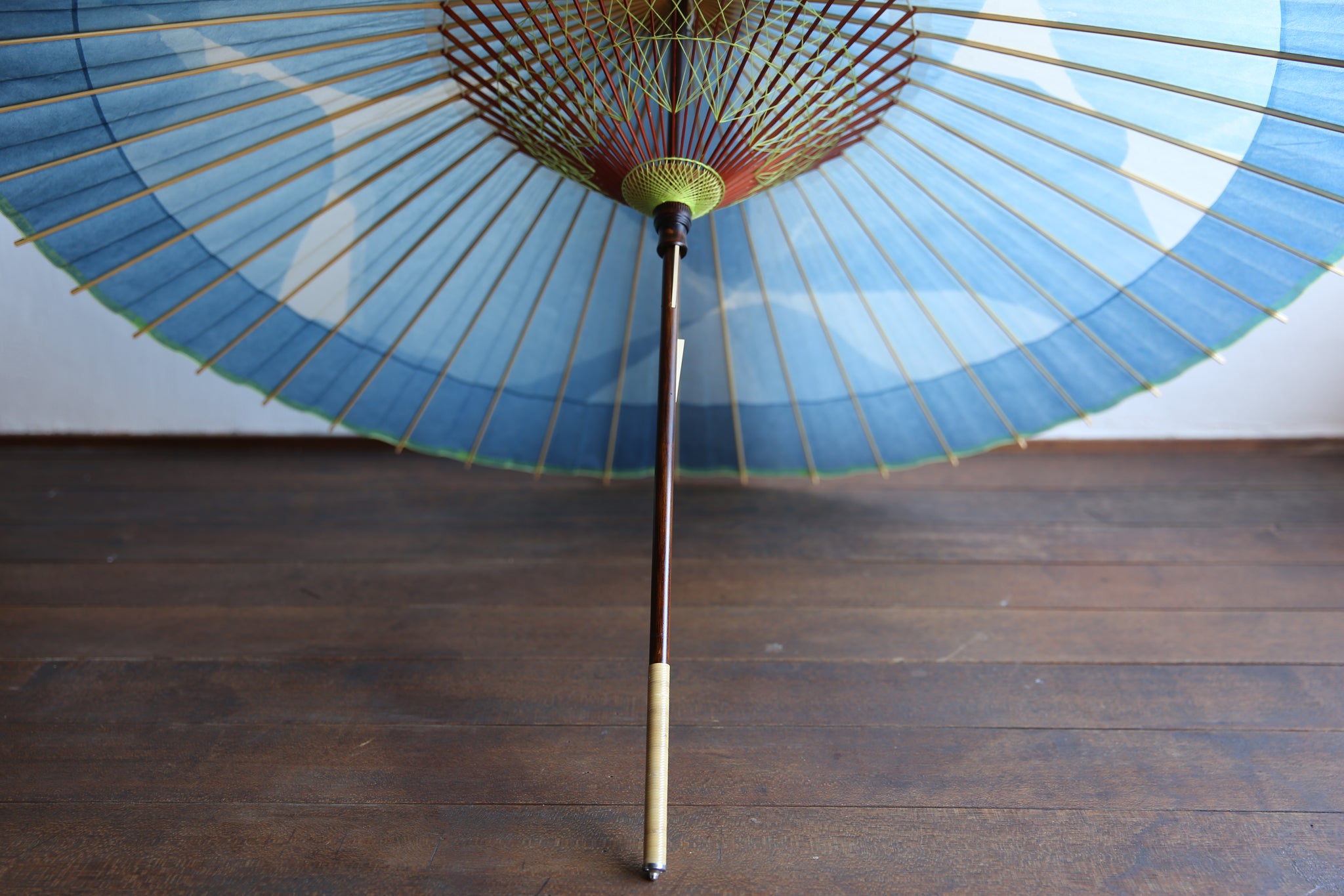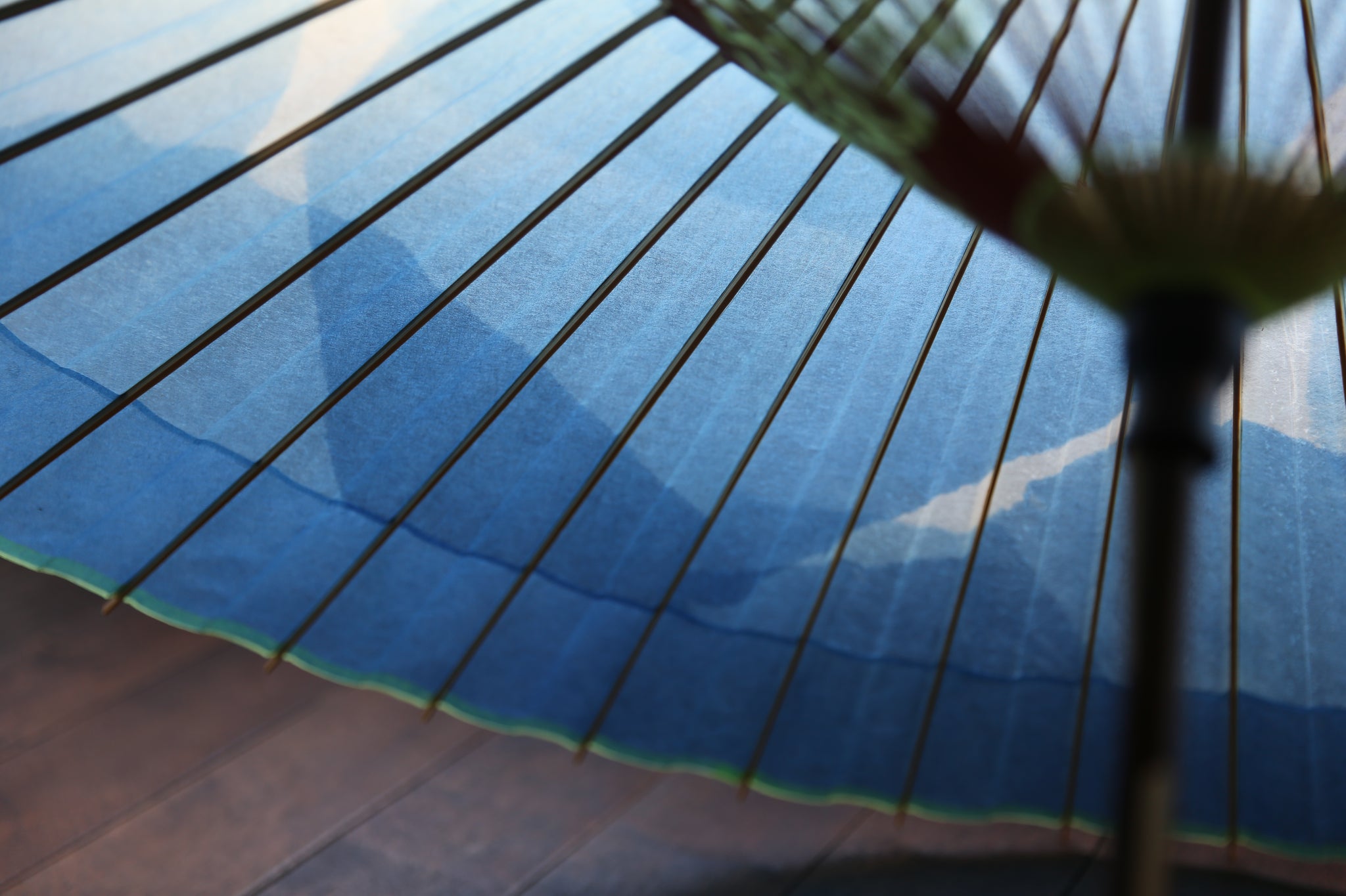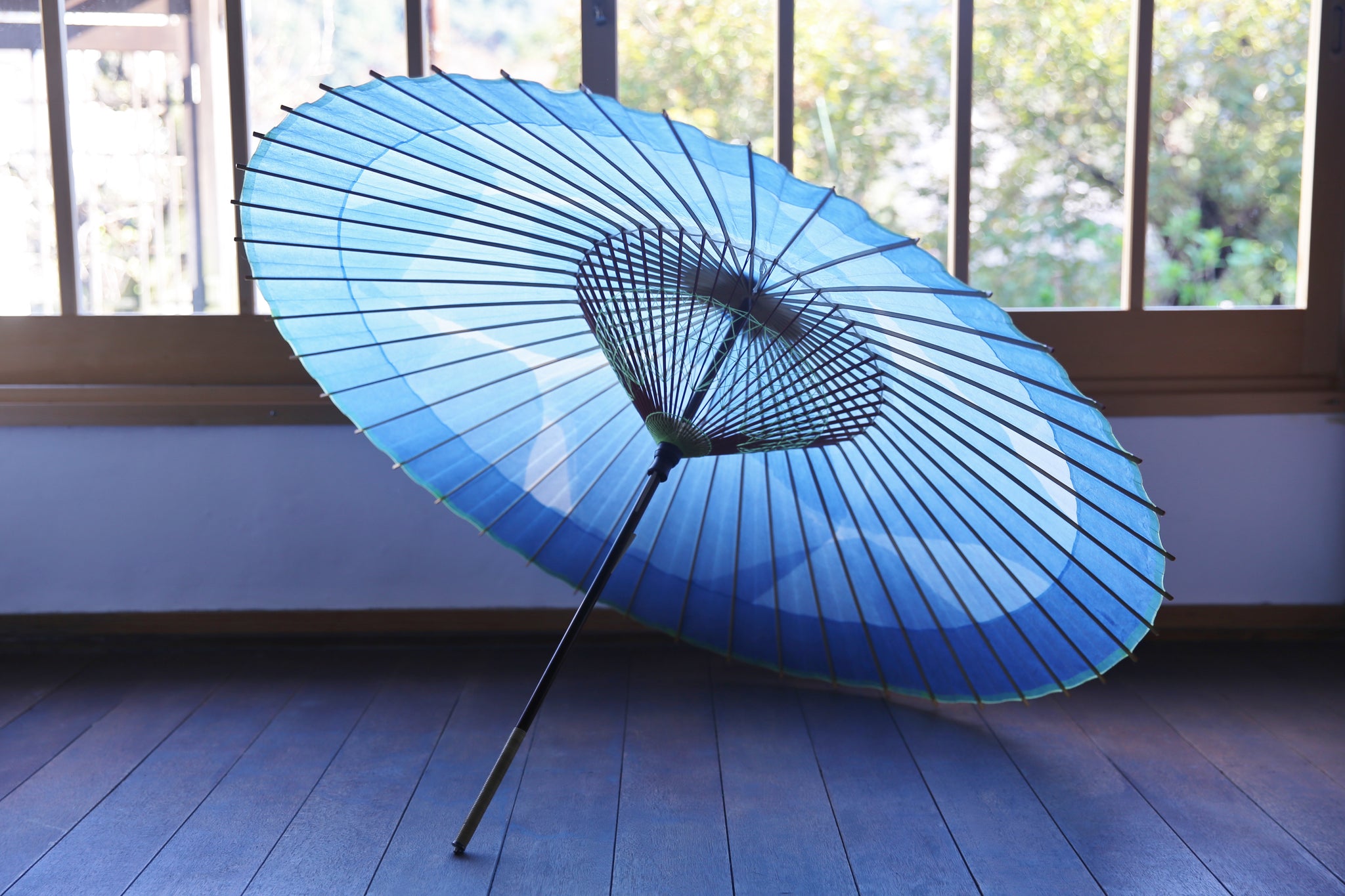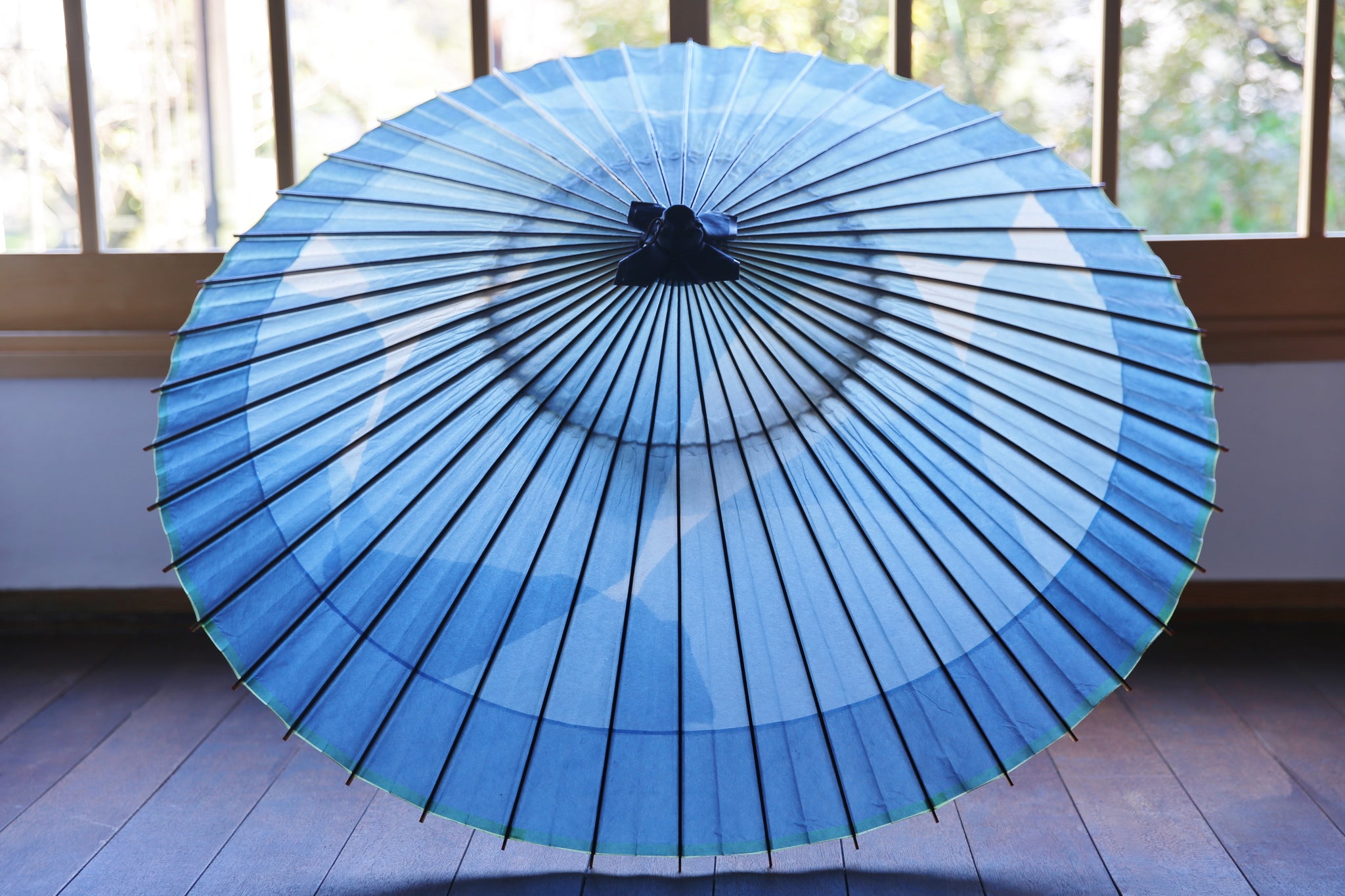 An unmistakable special collaboration Japanese umbrella made from Mino handmade Japanese paper dyed with indigo grown in Gifu's Ishitoru Shiro.