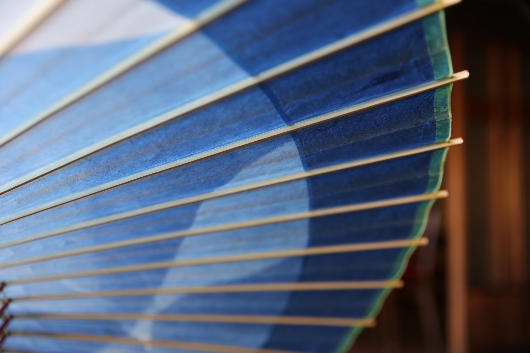 The framework of a Japanese umbrella is made from a piece of bamboo that is split evenly and assembled so that when the umbrella is folded, it returns to its original shape.