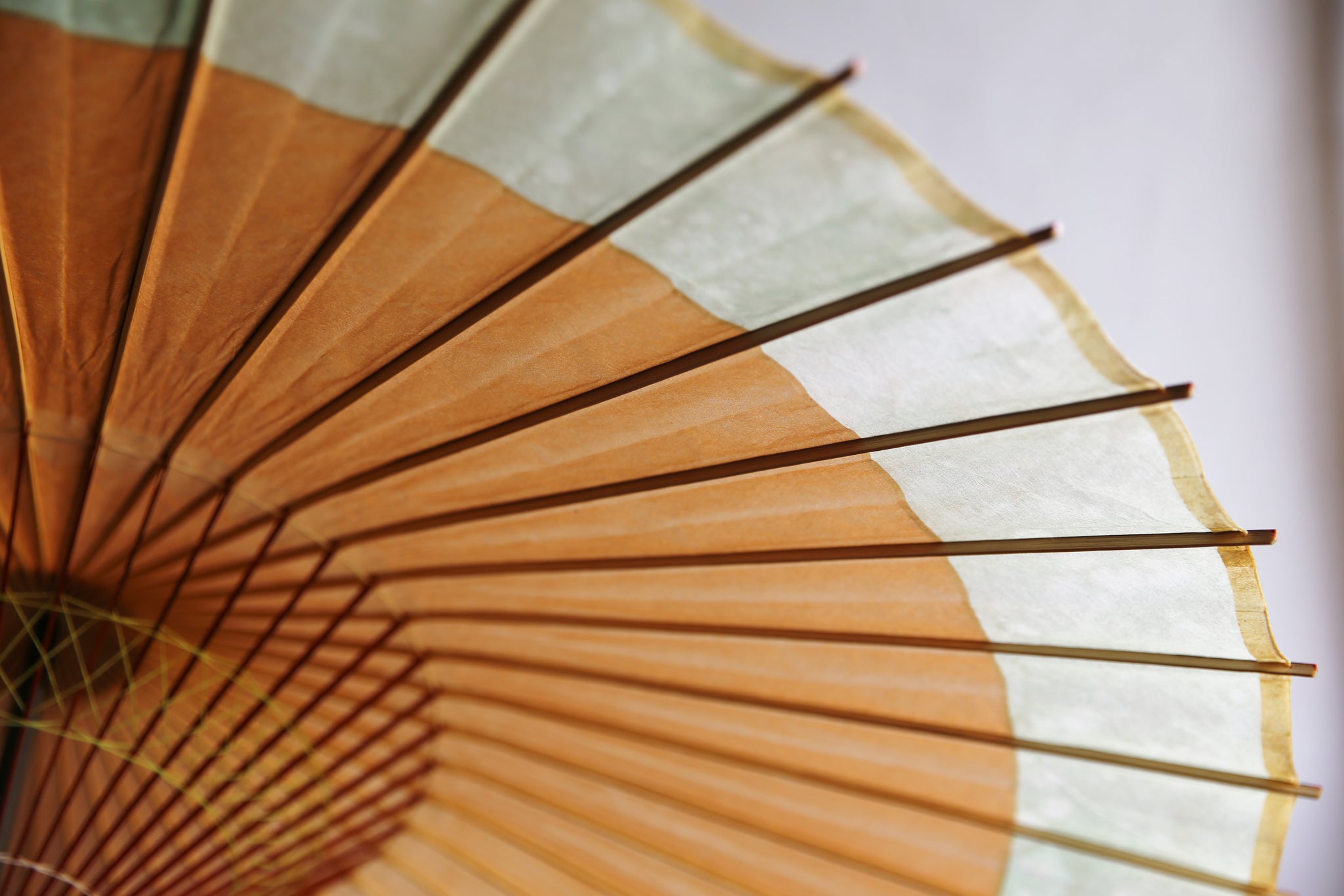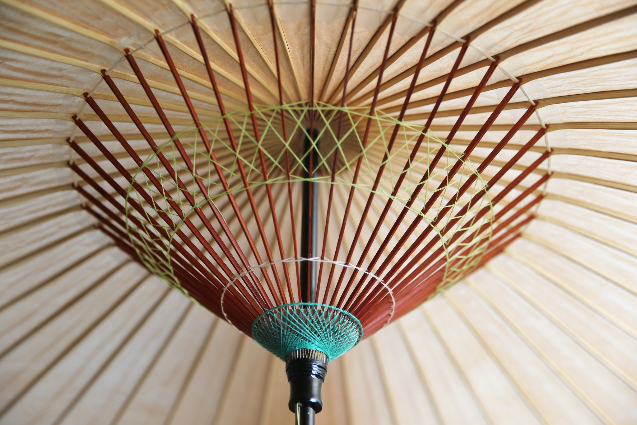 The framework of a Japanese umbrella is made from a piece of bamboo that is split evenly and assembled so that when the umbrella is folded, it returns to its original shape.