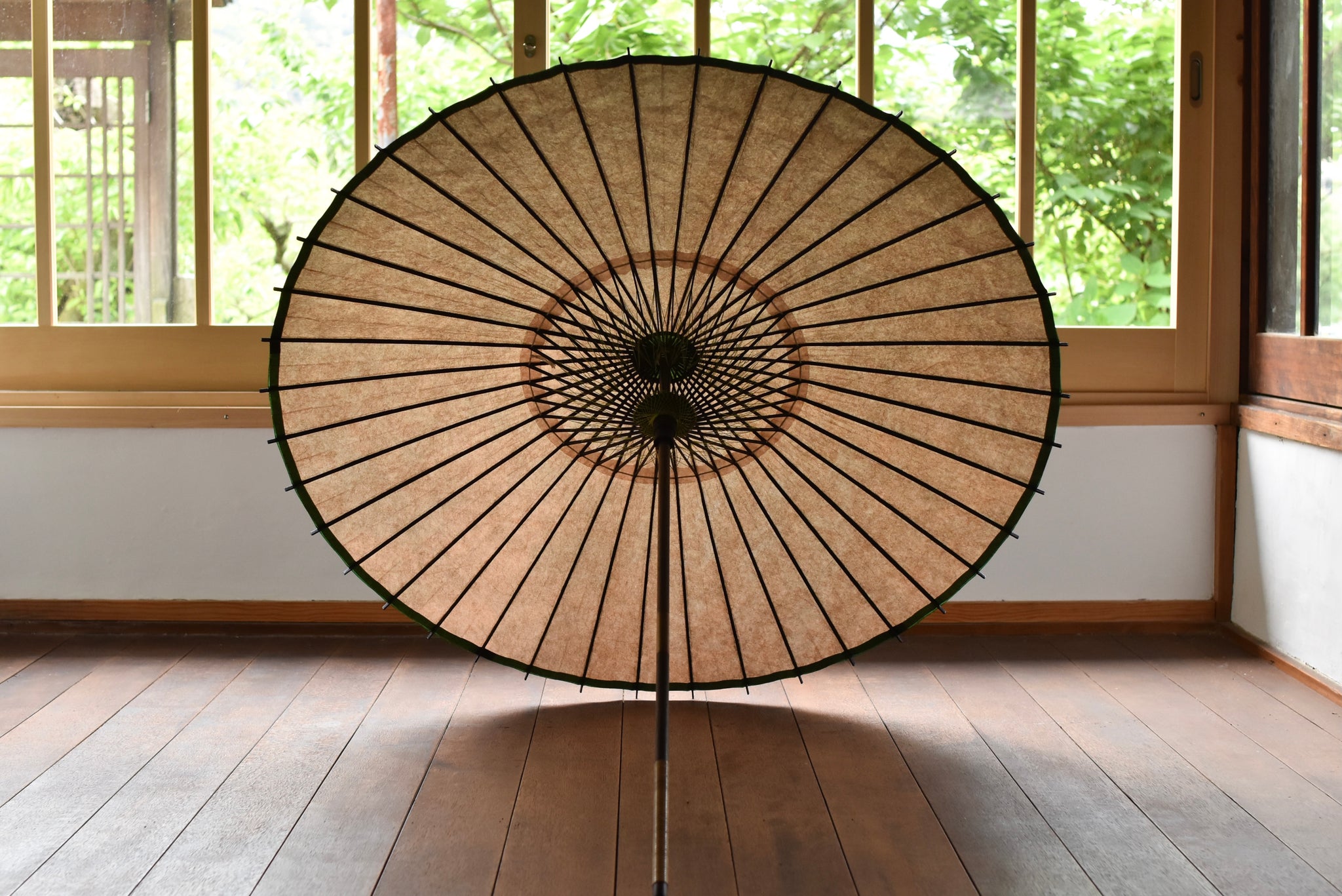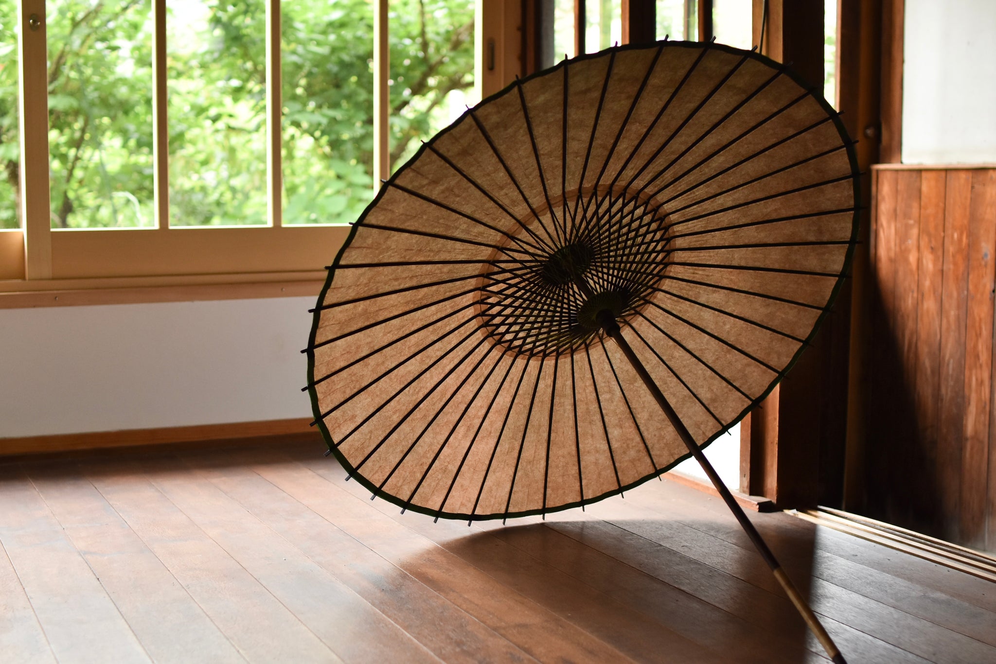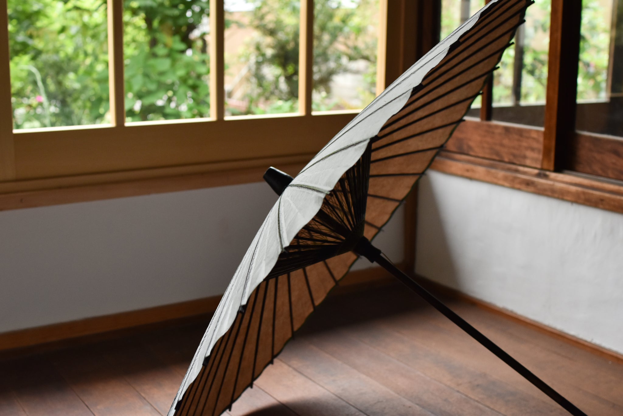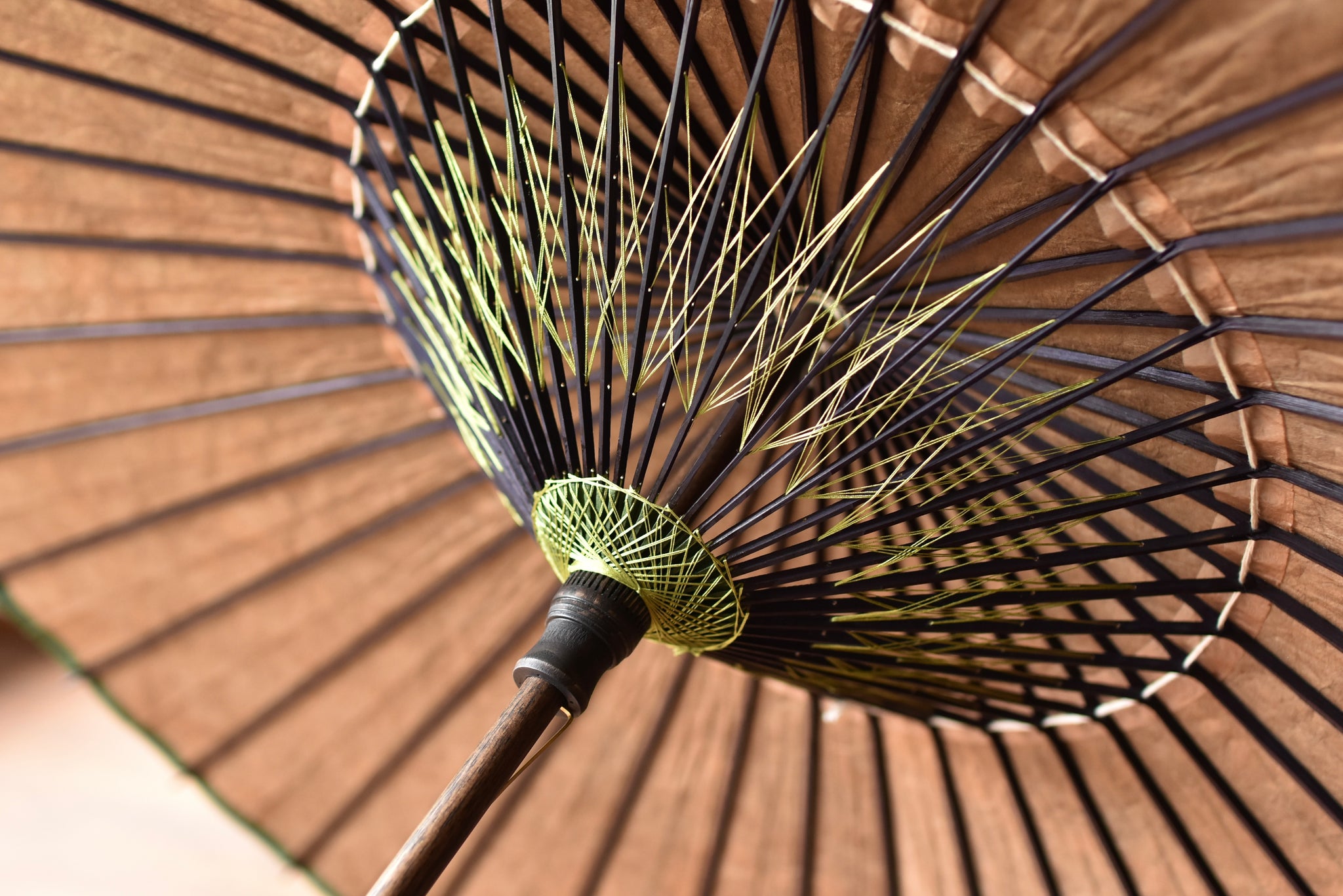 The framework of a Japanese umbrella is made from a piece of bamboo that is split evenly and assembled so that when the umbrella is folded, it returns to its original shape.