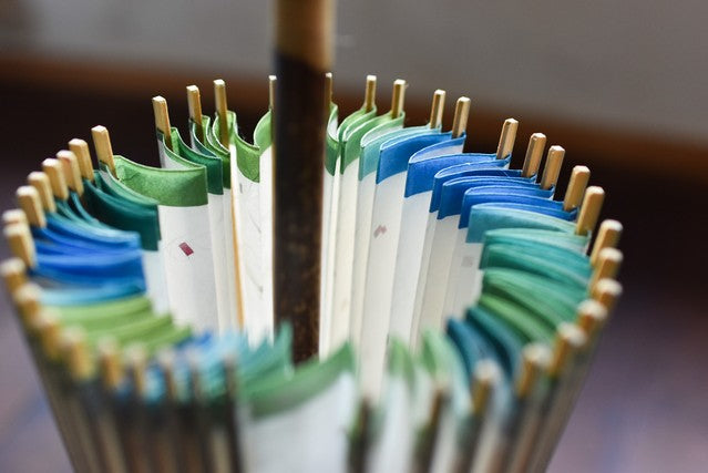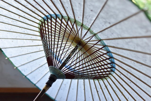 The framework of a Japanese umbrella is made from a piece of bamboo that is split evenly and assembled so that when the umbrella is folded, it returns to its original shape.