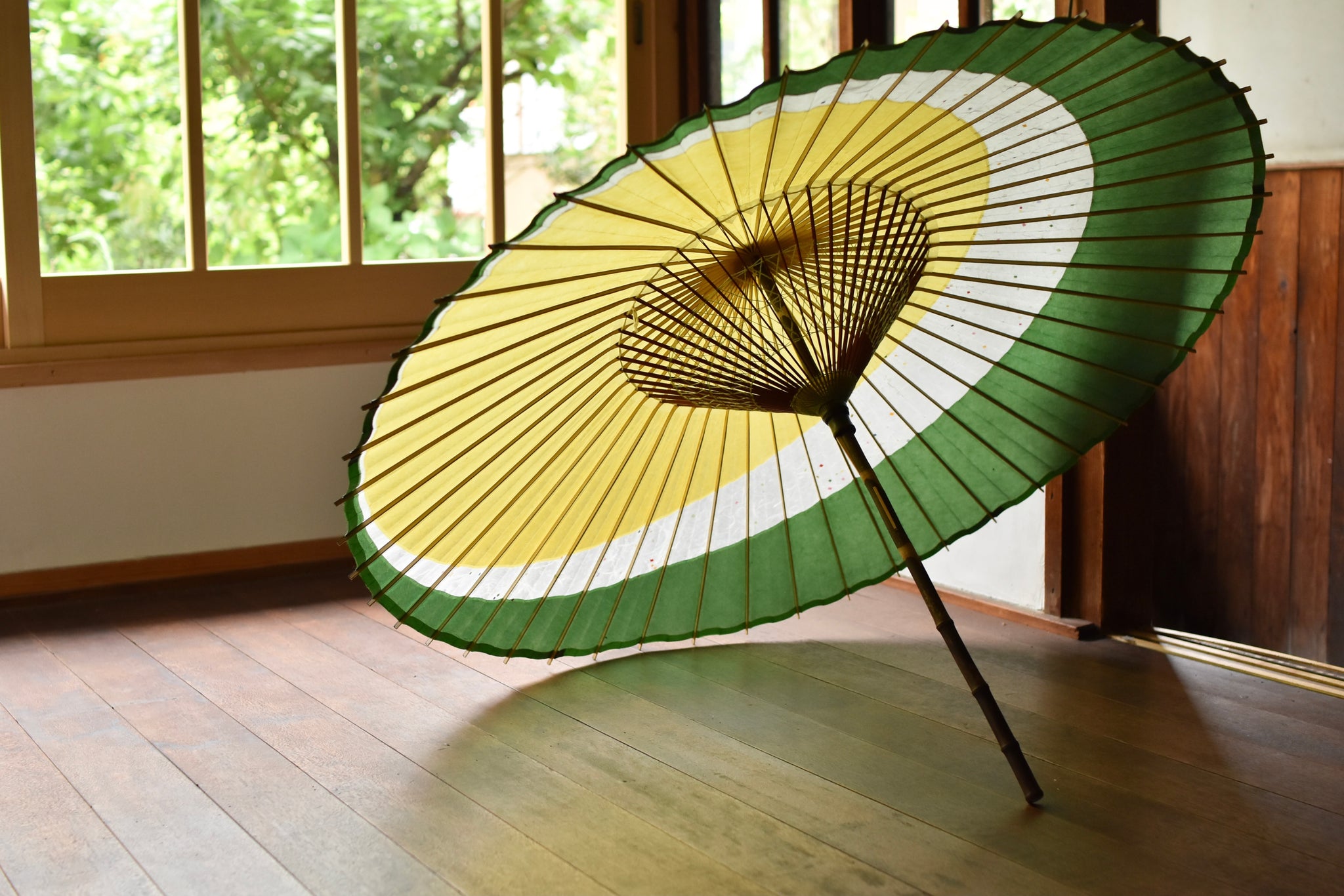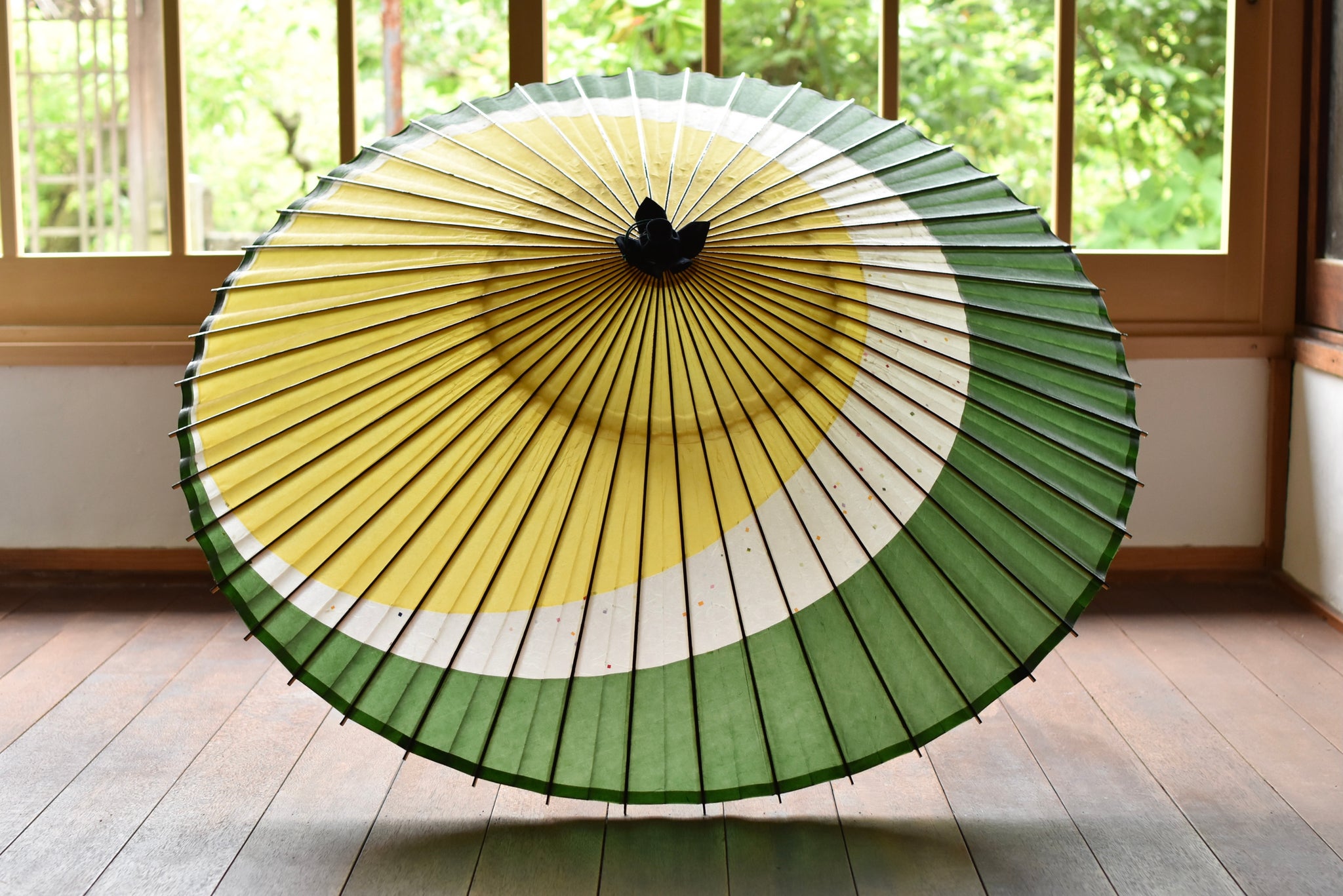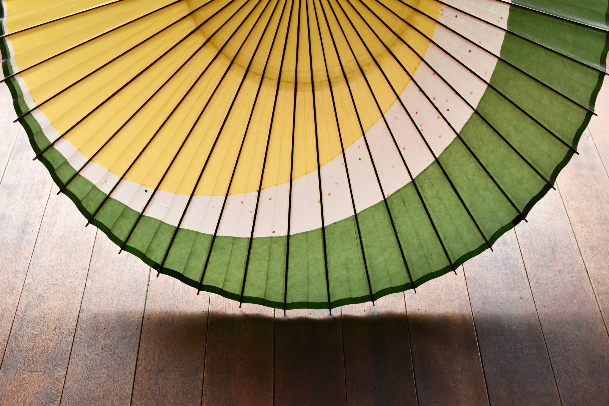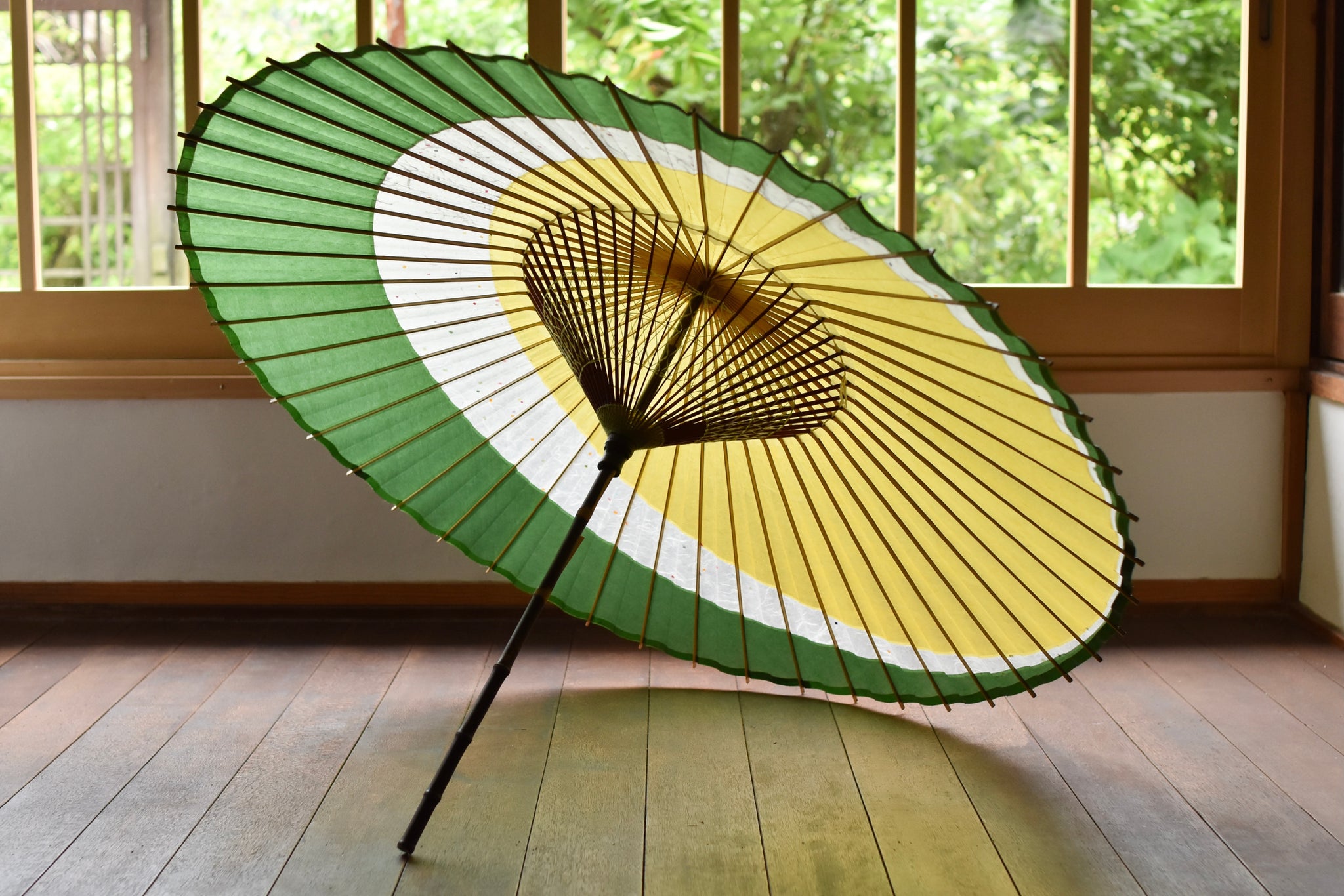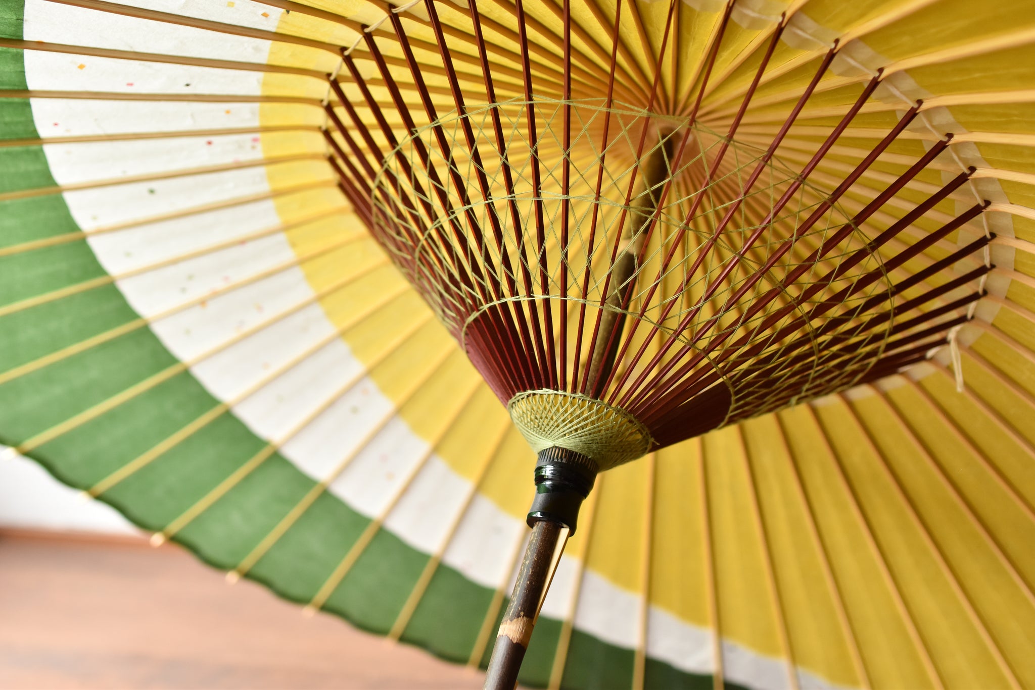 The framework of a Japanese umbrella is made from a piece of bamboo that is split evenly and assembled so that when the umbrella is folded, it returns to its original shape.
