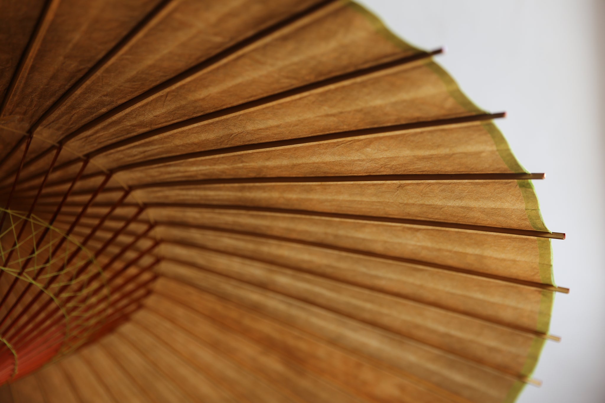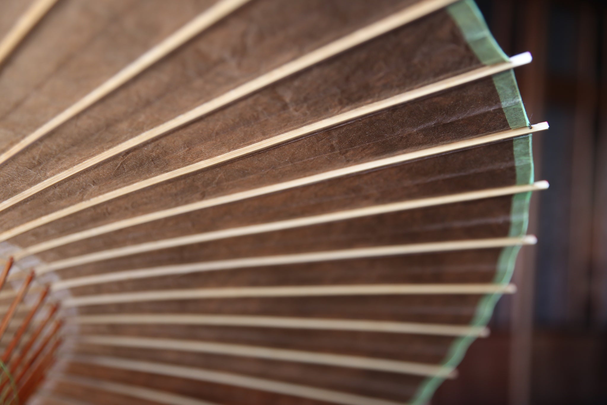 The framework of a Japanese umbrella is made from a piece of bamboo that is split evenly and assembled so that when the umbrella is folded, it returns to its original shape.