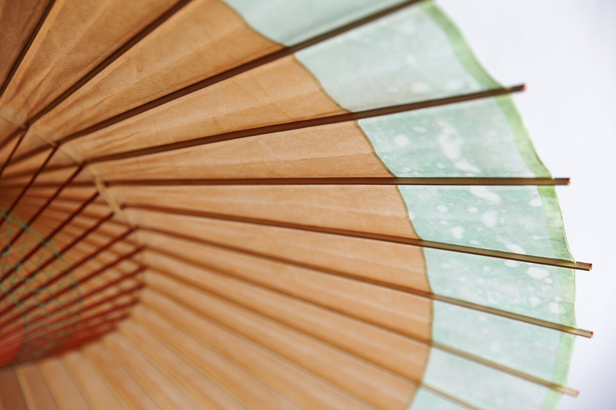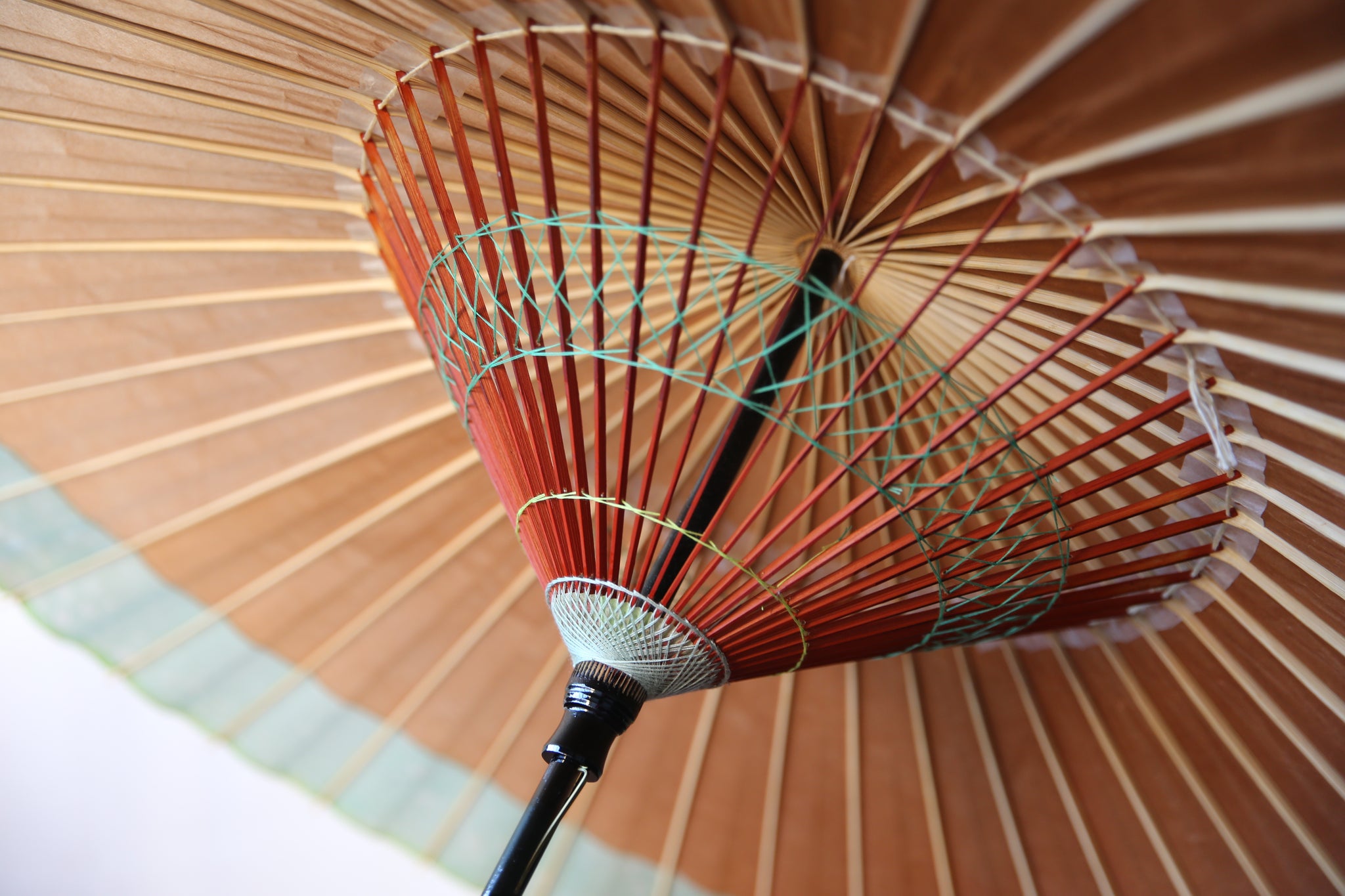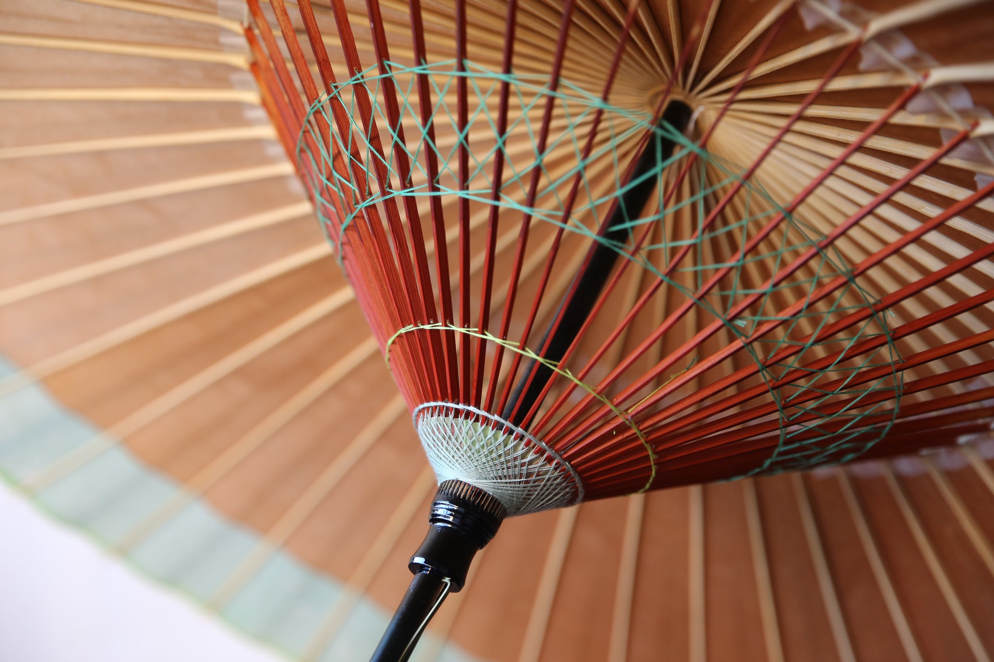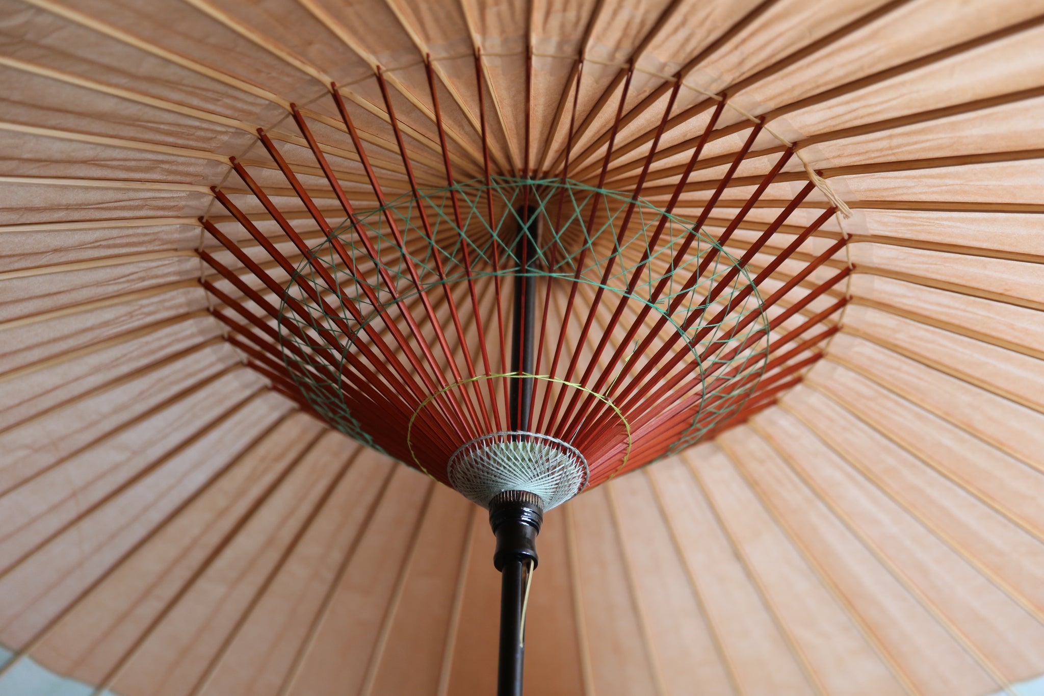 The framework of a Japanese umbrella is made from a piece of bamboo that is split evenly and assembled so that when the umbrella is folded, it returns to its original shape.