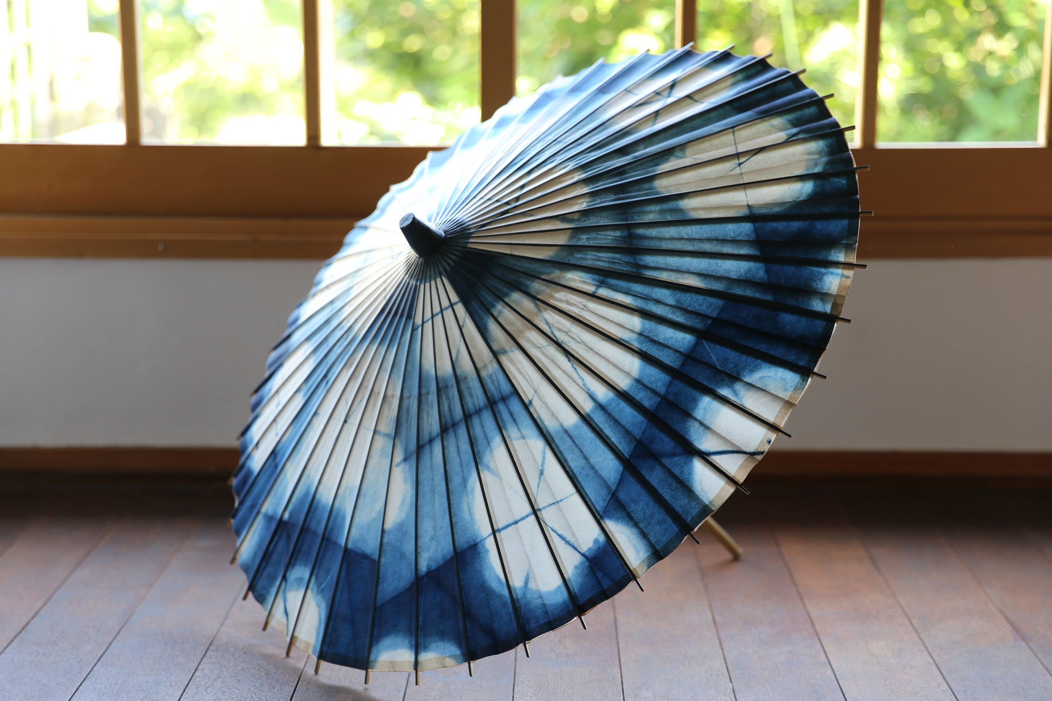 Un paraguas japonés de colaboración especial verdaderamente único en su tipo hecho de papel japonés hecho a mano de Mino teñido con índigo cultivado en Itetsu-shiro de Gifu.