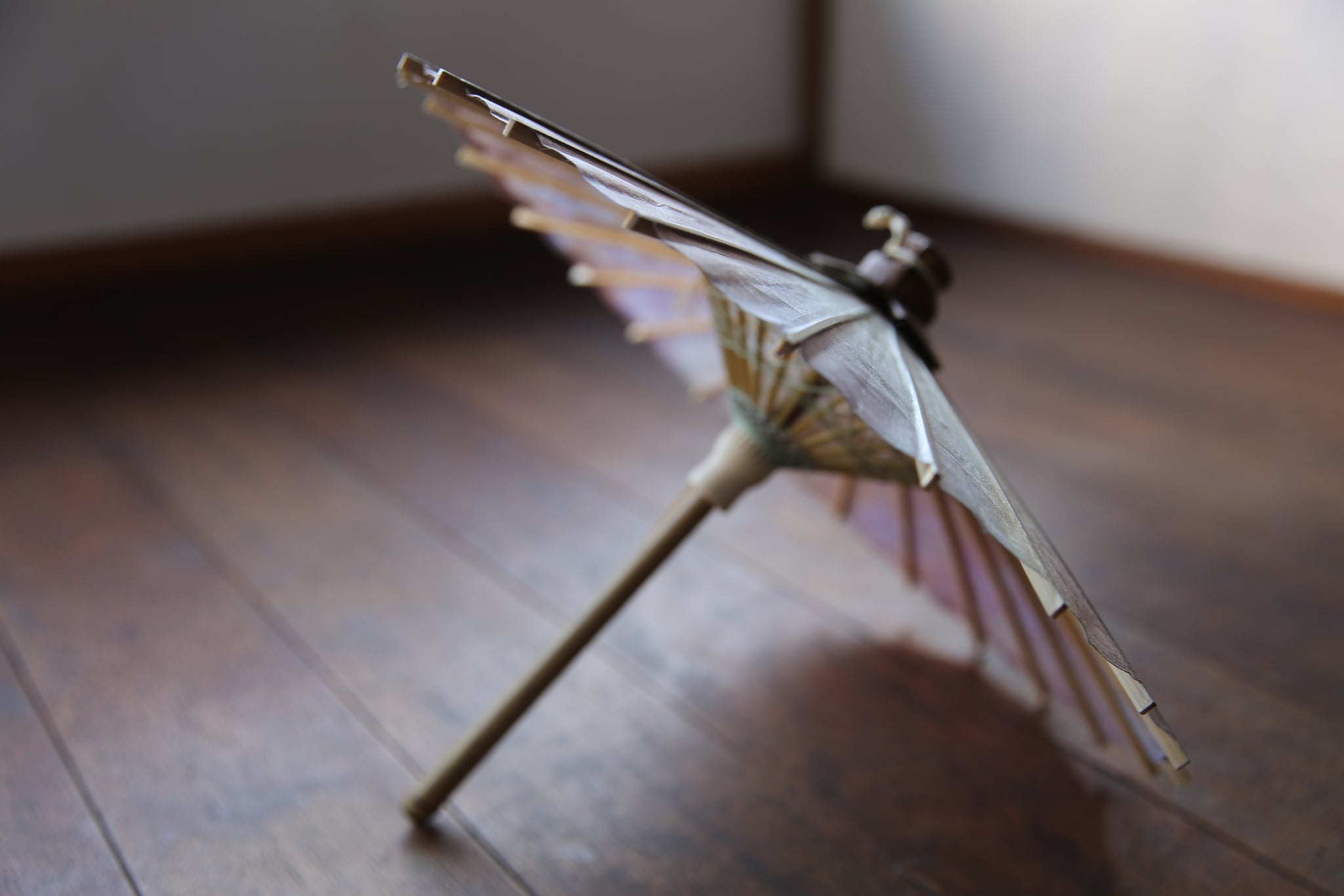 日本伞的骨架由一块竹子制成,将其均匀劈开并组装起来,这样当伞折叠时,它就会恢复到原来的形状。